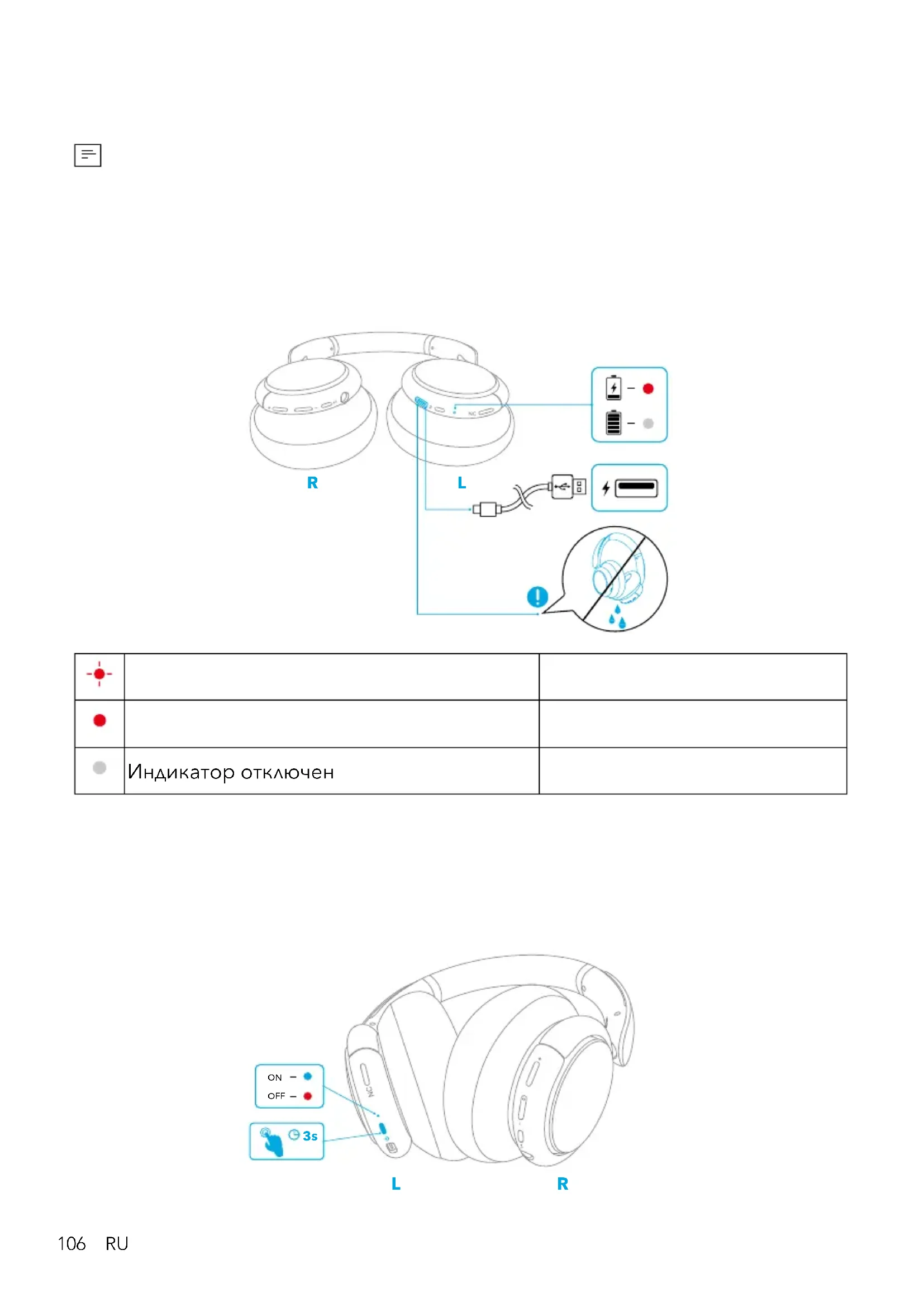 - Вовремязарядкиневключайтенаушники. R L Мигаеткраснымразв60секундНизкийзарядаккумулятора ГориткраснымсветомВыполняетсязарядка Индикатор отключен Полностьюзаряжены Включение/выключение Нажмитеиудерживайтекнопкупитаниявтечение3секунддлявключения/ выключенияпитания.