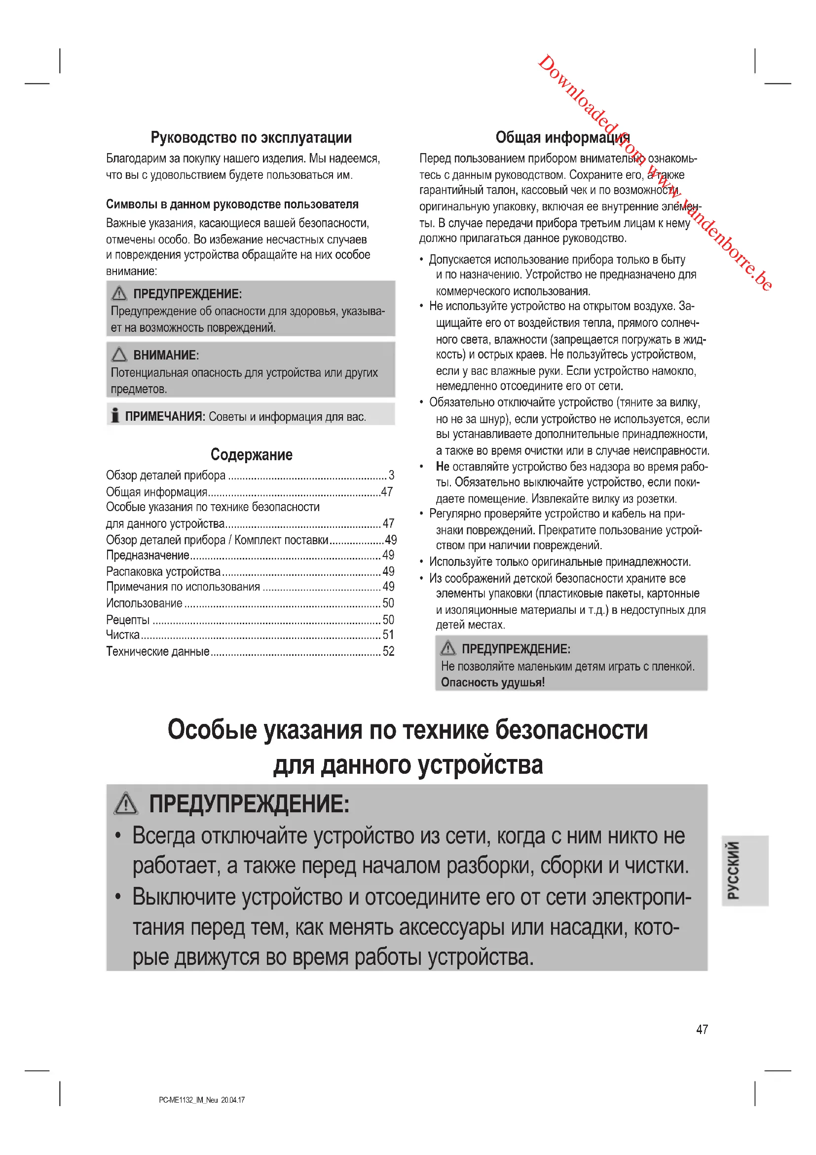 - Выключите устройство и отсоедините его от сети электропи- тания перед тем, как менять аксессуары или насадки, кото- рые движутся во время работы устройства. Downloaded from www.vandenborre.be48 PC-ME1132_IM_Neu 20.04.17 ПРЕДУПРЕЖДЕНИЕ: