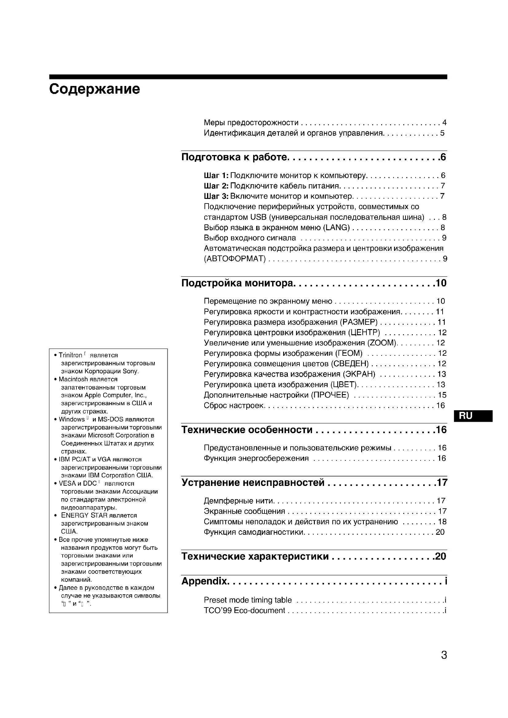 Меры предосторожности . . . . . . . . . . . . . . . . . . . . . . . . . . . . . . . . 4 Идентификация деталей и органов управления. . . . . . . . . . . . . 5 Подготовка к работе. . . . . . . . . . . . . . . . . . . . . . . . . . . .6 Шаг 1: Подключите монитор к компьютеру. . . . . . . . . . . . . . . . . 6 Шаг 2: Подключите кабель питания. . . . . . . . . . . . . . . . . . . . . . . 7 Шаг 3: Включите монитор и компьютер. . . . . . . . . . . . . . . . . . . . 7 Подключение периферийных устройств, совместимых со стандартом USB (универсальная последовательная шина) . . . 8 Выбор языка в экранном меню (LANG) . . . . . . . . . . . . . . . . . . . . 8 Выбор входного сигнала . . . . . . . . . . . . . . . . . . . . . . . . . . . . . . . . 9 Автоматическая подстройка размера и центровки изображения (АВТОФОРМАТ) . . . . . . . . . . . . . . . . . . . . . . . . . . . . . . . . . . . . . . . 9 Подстройка монитора. . . . . . . . . . . . . . . . . . . . . . . . . .10 Перемещение по экранному меню . . . . . . . . . . . . . . . . . . . . . . . 10 Регулировка яркости и контрастности изображения. . . . . . . . 11 Регулировка размера изображения (PAЗMEP) . . . . . . . . . . . . . 11 Регулировка центровки изображения (ЦEHTP) . . . . . . . . . . . . 12 Увеличение или уменьшение изображения (ZOOM). . . . . . . . . 12 Регулировка формы изображения (ГEOM) . . . . . . . . . . . . . . . . 12 Регулировка совмещения цветов (СВЕДЕН) . . . . . . . . . . . . . . . 12 Регулировка качества изображения (ЭКРАН) . . . . . . . . . . . . . 13 Регулировка цвета изображения (ЦВЕТ). . . . . . . . . . . . . . . . . . 13 Дополнительные настройки (ПPOЧEE) . . . . . . . . . . . . . . . . . . . 15 Сброс настроек. . . . . . . . . . . . . . . . . . . . . . . . . . . . . . . . . . . . . . . 16 Технические особенности . . . . . . . . . . . . . . . . . . . . . .16 Предустановленные и пользовательские режимы . . . . . . . . . . 16 Функция энергосбережения . . . . . . . . . . . . . . . . . . . . . . . . . . . . 16 Устранение неисправностей . . . . . . . . . . . . . . . . . . . .17 Демпферные нити. . . . . . . . . . . . . . . . . . . . . . . . . . . . . . . . . . . . . 17 Экранные сообщения . . . . . . . . . . . . . . . . . . . . . . . . . . . . . . . . . . 17 Симптомы неполадок и действия по их устранению . . . . . . . . 18 Функция самодиагностики. . . . . . . . . . . . . . . . . . . . . . . . . . . . . . 20 Технические характеристики . . . . . . . . . . . . . . . . . . .20 Appendix. . . . . . . . . . . . . . . . . . . . . . . . . . . . . . . . . . . . . . . i Preset mode timing table . . . . . . . . . . . . . . . . . . . . . . . . . . . . . . . . . .i TCO’99 Eco-document . . . . . . . . . . . . . . . . . . . . . . . . . . . . . . . . . . . .i4 Меры предосторожности Меры предосторожности при подключении к сети электропитания