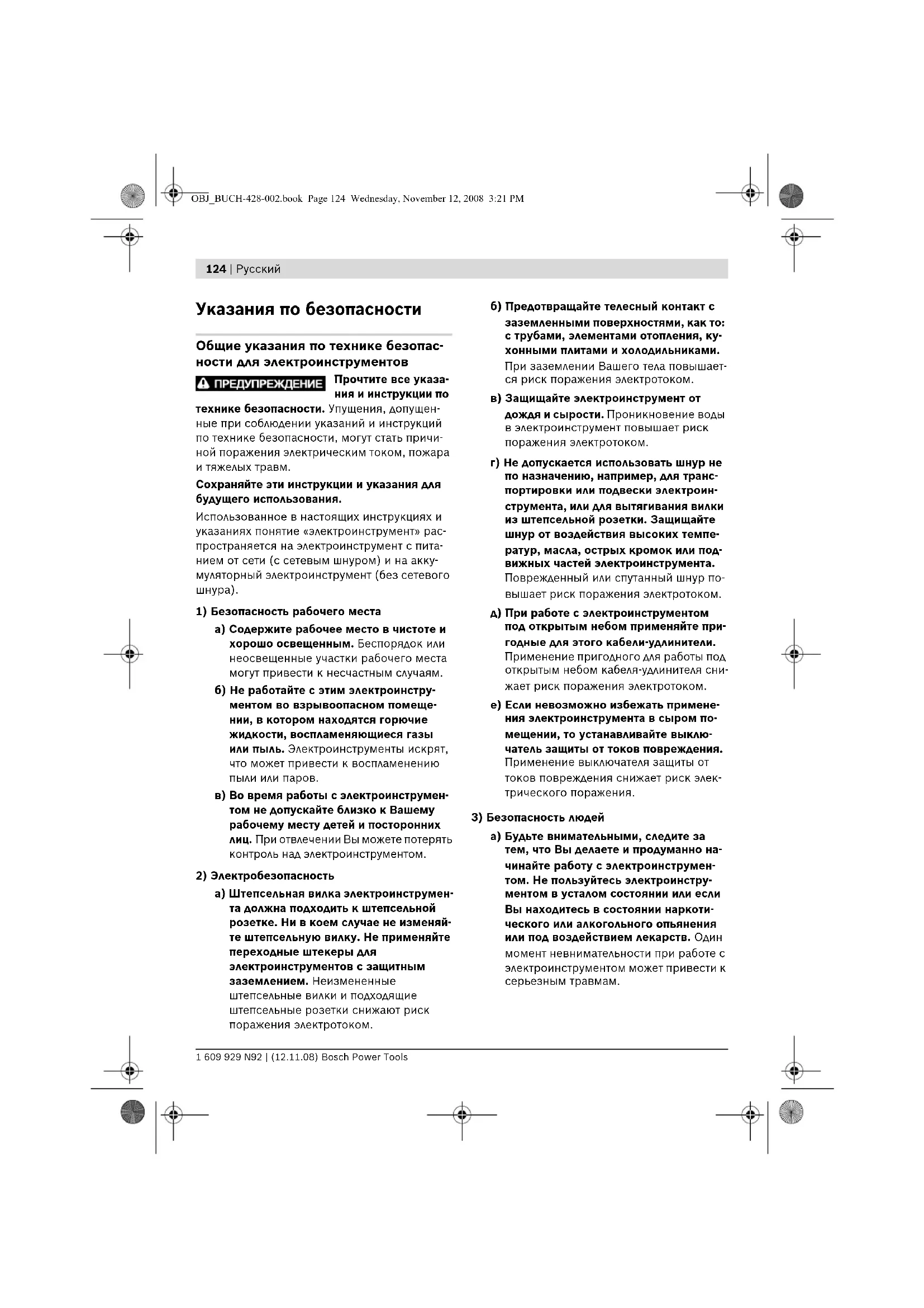 а) Будьте внимательными, следите за тем, что Вы делаете и продуманно на- чинайте работу с электроинструмен- том. Не пользуйтесь электроинстру- ментом в усталом состоянии или если Вы находитесь в состоянии наркоти- ческого или алкогольного опьянения или под воздействием лекарств. Один момент невнимательности при работе с электроинструментом может привести к серьезным травмам. OBJ_BUCH-428-002.book Page 124 Wednesday, November 12, 2008 3:21 PMРусский | 125 Bosch Power Tools 1 609 929 N92 | (12.11.08) б) Применяйте средства индивидуальный защиты и всегда защитные очки. Использование средств индивидуальной защиты, как то: защитной маски, обуви на нескользящей подошве, защитного шлема или средств защиты органов слуха, – в зависимости от вида работы электроинструмента снижает риск получения травм. в) Предотвращайте непреднамеренное включение электроинструмента. Перед подключением электроинструмента к электропитанию и/или к аккумулятору убедитесь в выключенном состоянии электроинструмента. Если Вы при тран- спортировке электроинструмента дер- жите палец на выключателе или вклю- ченный электроинструмент подключаете к сети питания, то это может привести к несчастному случаю. г) Убирайте установочный инструмент или гаечные ключи до включения электроинструмента. Инструмент или ключ, находящийся во вращающейся части электроинструмента, может привести к травмам. д) Не принимайте неестественное поло- жение корпуса тела. Всегда занимайте устойчивое положение и сохраняйте равновесие. Благодаря этому Вы можете лучше контролировать электро- инструмент в неожиданных ситуациях. е) Носите подходящую рабочую одежду. Не носите широкую одежду и украше- ния. Держите волосы, одежду и рука- вицы вдали от движущихся частей. Широкая одежда, украшения или длин- ные волосы могут быть затянуты вра- щающимися частями. ж)При наличии возможности установки пылеотсасывающих и пылесборных устройств проверяйте их присоеди- нение и правильное использование. Применение пылеотсоса может снизить опасность, создаваемую пылью.