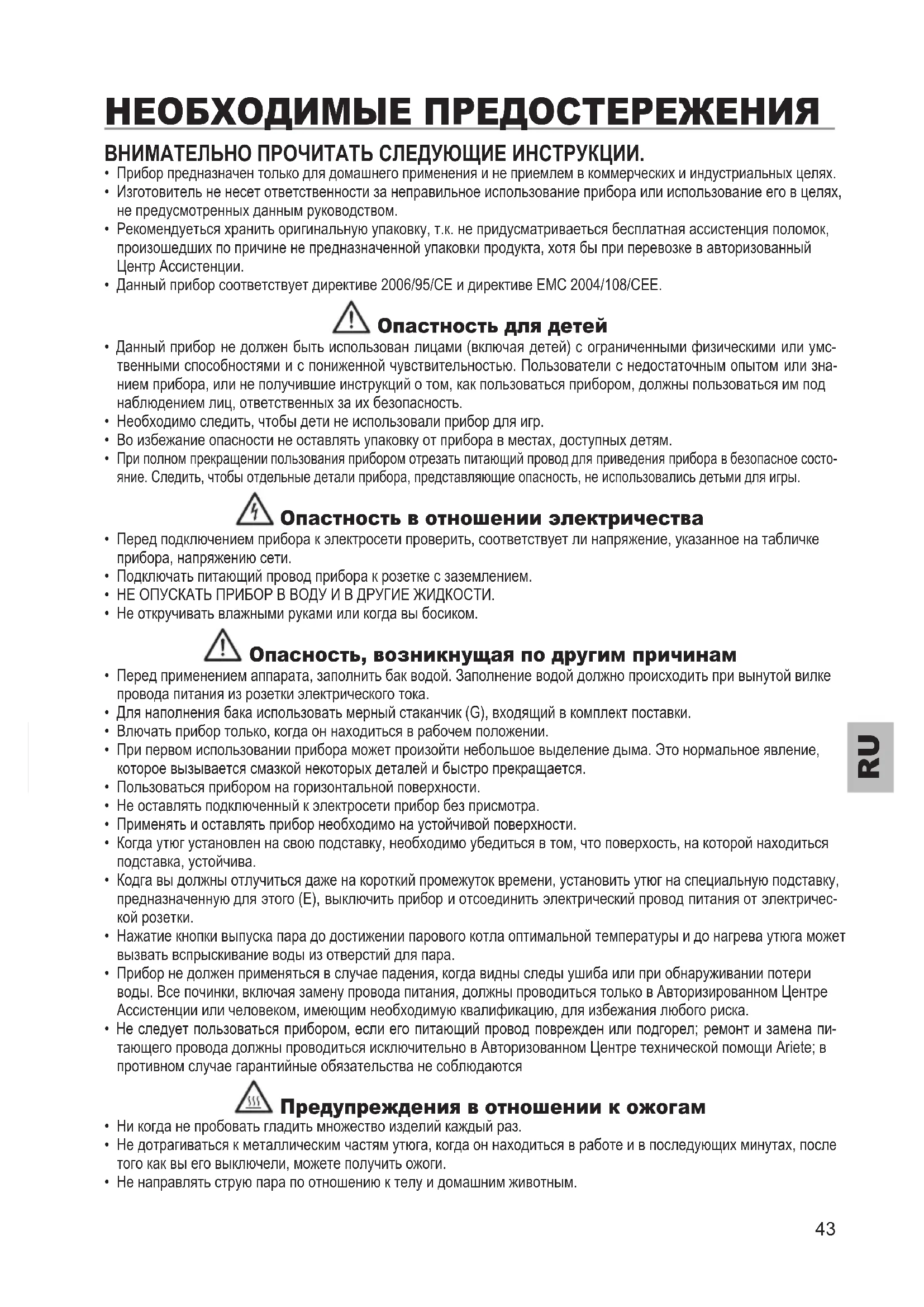 Прибор предназначен только для домашнего применения и не приемлем в коммерческих и индустриальных целях.• Изготовитель не несет ответственности за неправильное использование прибора или использование его в целях, не предусмотренных данным руководством. • Рекомендуеться хранить оригинальную упаковку, т.к. не придусматриваеться бесплатная ассистенция поломок, произошедших по причине не предназначенной упаковки продукта, хотя бы при перевозке в авторизованный Центр Ассистенции. • Данный прибор соответствует директиве 2006/95/CE и директиве EMC 2004/108/CEE. Oпастность для детей