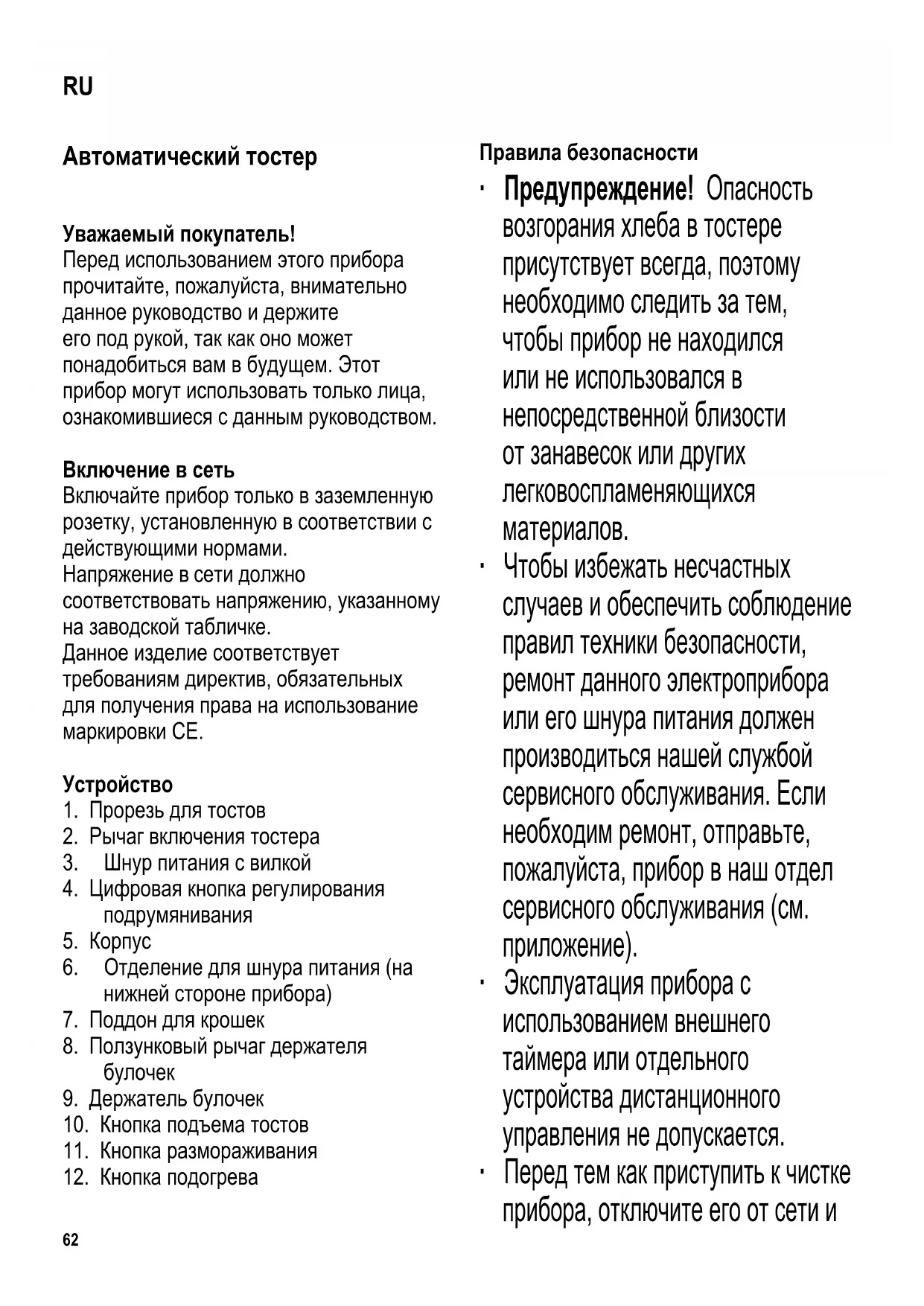 Η εγγύηση αυτή δεν καλύπτει φυσικές φθορές ούτε τα εύθραυστα μέρη της συσκευής.62 Автоматический тостер Уважаемый покупатель! Перед использованием этого прибора прочитайте, пожалуйста, внимательно данное руководство и держите его под рукой, так как оно может понадобиться вам в будущем. Этот прибор могут использовать только лица, ознакомившиеся с данным руководством. Включение в сеть Включайте прибор только в заземленную розетку, установленную в соответствии с действующими нормами. Напряжение в сети должно соответствовать напряжению, указанному на заводской табличке. Данное изделие соответствует требованиям директив, обязательных для получения права на использование маркировки СЕ.