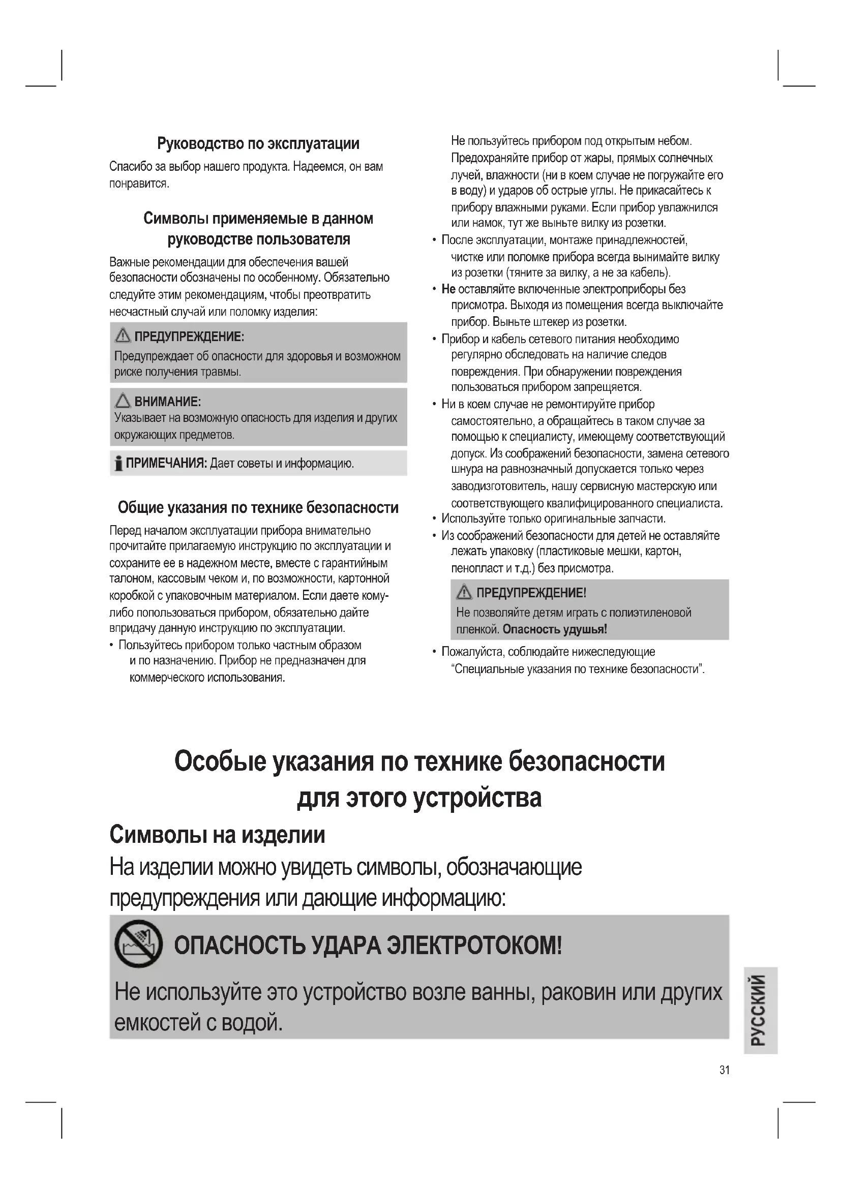- Пользуйтесь прибором только частным образом и по назначению. Прибор не предназначен для коммерческого использования. Особые указания по технике безопасности для этого устройства Символы на изделии На изделии можно увидеть символы, обозначающие предупреждения или дающие информацию: ОПАСНОСТЬ УДАРА ЭЛЕКТРОТОКОМ! Не используйте это устройство возле ванны, раковин или других емкостей с водой.32 ПРЕДУПРЕЖДЕНИЕ: