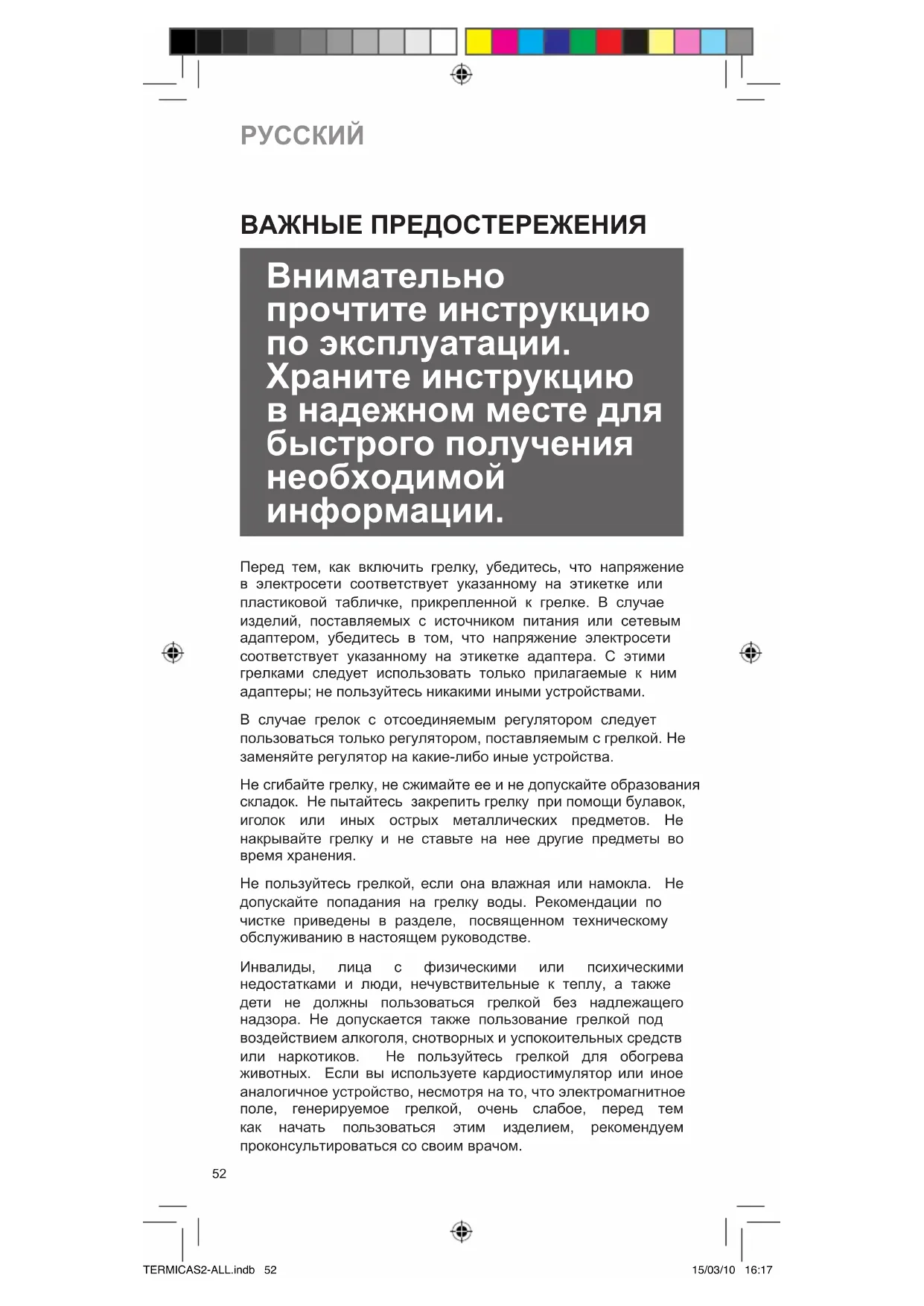 ВАЖНЫЕ ПРЕДОСТЕРЕЖЕНИЯ Внимательно прочтите инструкцию по эксплуатации. Храните инструкцию в надежном месте для быстрого получения необходимой информации. Перед тем, как включить грелку, убедитесь, что напряжение в электросети соответствует указанному на этикетке или пластиковой табличке, прикрепленной к грелке. В случае изделий, поставляемых с источником питания или сетевым адаптером, убедитесь в том, что напряжение электросети соответствует указанному на этикетке адаптера. С этими грелками следует использовать только прилагаемые к ним адаптеры; не пользуйтесь никакими иными устройствами. В случае грелок с отсоединяемым регулятором следует пользоваться только регулятором, поставляемым с грелкой. Не заменяйте регулятор на какие-либо иные устройства. Не сгибайте грелку, не сжимайте ее и не допускайте образования складок. Не пытайтесь закрепить грелку при помощи булавок, иголок или иных острых металлических предметов. Не накрывайте грелку и не ставьте на нее другие предметы во время хранения. Не пользуйтесь грелкой, если она влажная или намокла. Не допускайте попадания на грелку воды. Рекомендации по чистке приведены в разделе, посвященном техническому обслуживанию в настоящем руководстве. Инвалиды, лица с физическими или психическими недостатками и люди, нечувствительные к теплу, а также дети не должны пользоваться грелкой без надлежащего надзора. Не допускается также пользование грелкой под воздействием алкоголя, снотворных и успокоительных средств или наркотиков. Не пользуйтесь грелкой для обогрева животных. Если вы используете кардиостимулятор или иное аналогичное устройство, несмотря на то, что электромагнитное поле, генерируемое грелкой, очень слабое, перед тем как начать пользоваться этим изделием, рекомендуем проконсультироваться со своим врачом. TERMICAS2-ALL.indb 52 15/03/10 16:1753 Длительное использование грелки при максимальной температуре может стать причиной ожога. Если грелка используется в течение продолжительного периода, например, кладется на ночь, следует отрегулировать температуру для длительного использования (настройка нагрева 1), как рекомендуется в настоящем руководстве. Данное изделие не предназначено для использования в медицинских целях в больницах. Во время эксплуатации не допускайте перегибов сетевого шнура или его соприкосновения с поверхностью грелки. Вынимая вилку сетевого шнура из розетки не тяните за шнур и не используйте сетевой шнур в качестве жгута. Регулярно осматривайте грелку, включая регулятор и гибкий шнур, на предмет возможных признаков износа или повреждений. В случае повреждения прекратите пользоваться грелкой и обратитесь в уполномоченный сервисный центр. Неправильная эксплуатация или модификация грелки ведет к прекращению действия гарантийных обязательств; по поводу ремонта обращайтесь только в уполномоченный сервисный