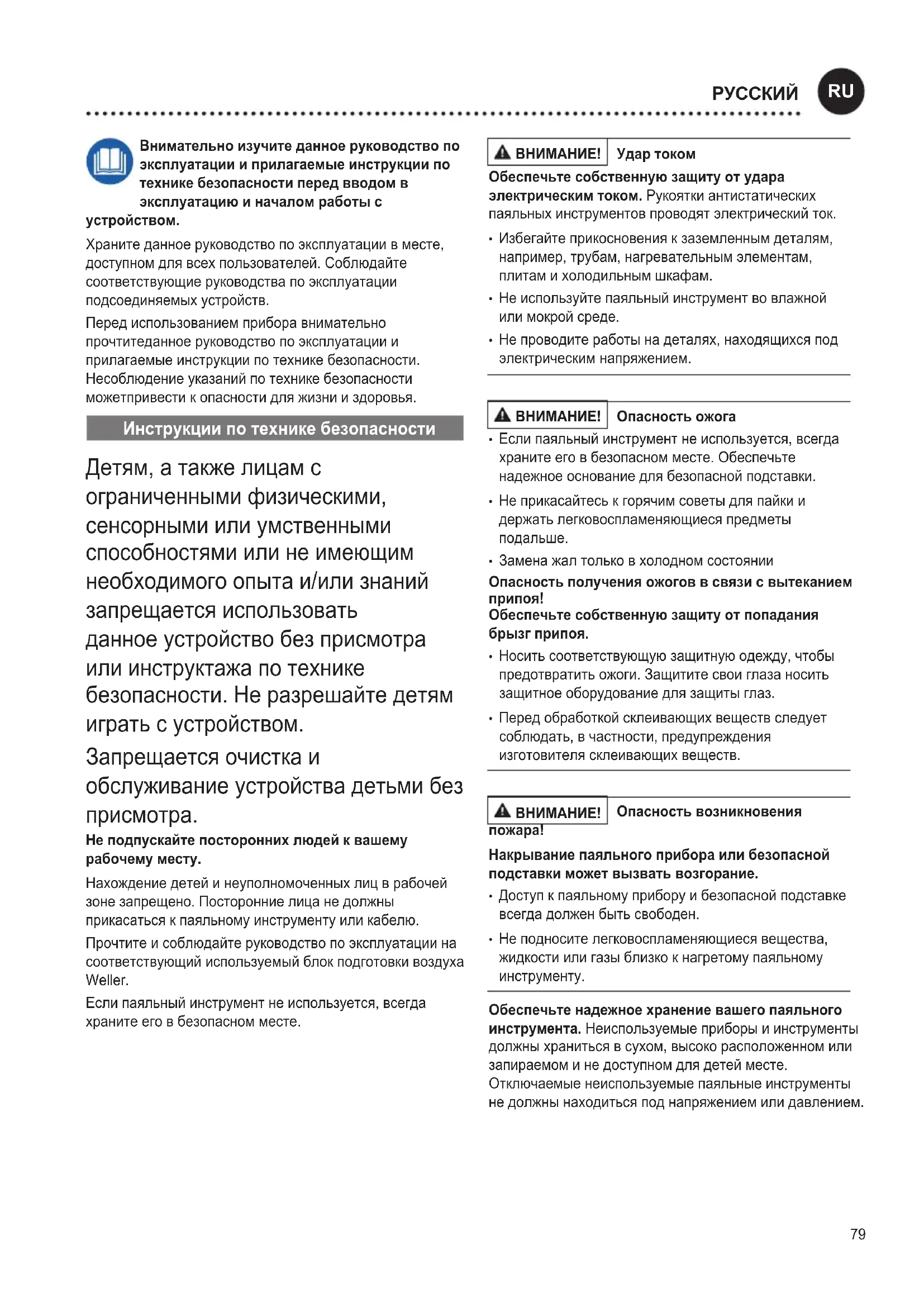 Не подпускайте посторонних людей к вашему рабочему месту. Нахождение детей и неуполномоченных лиц в рабочей зоне запрещено. Посторонние лица не должны прикасаться к паяльному инструменту или кабелю. Прочтите и соблюдайте руководство по эксплуатации на соответствующий используемый блок подготовки воздуха Weller. Если паяльный инструмент не используется, всегда храните его в безопасном месте.