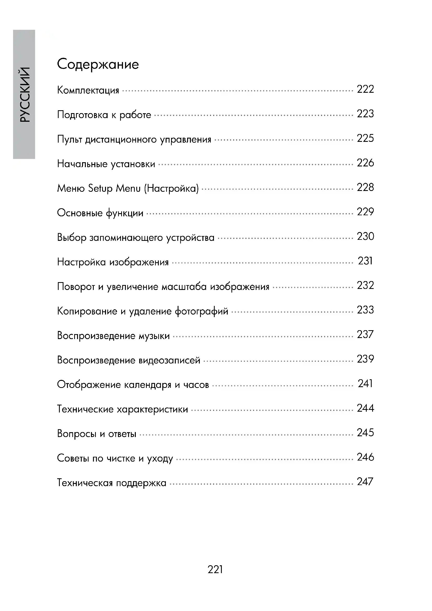 Комплектация Подготовка к работе Пульт дистанционного управления Начальные установки Меню Setup Menu (Настройка) Основные функции Выбор запоминающего устройства Настройка изображения Поворот и увеличение масштаба изображения Копирование и удаление фотографий Воспроизведение музыки Воспроизведение видеозаписей Отображение календаря и часов Технические характеристики Вопросы и ответы Советы по чистке и уходу Техническая поддержка