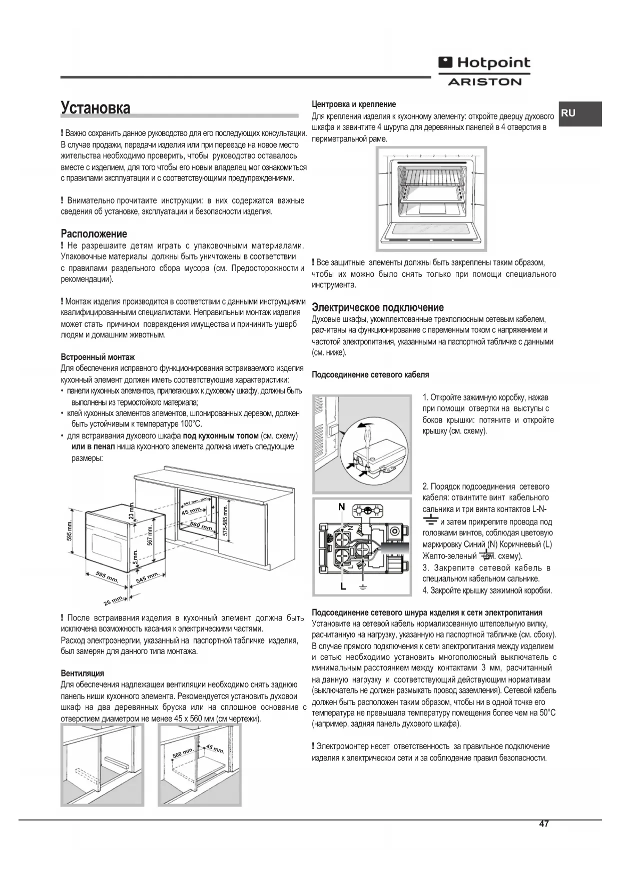 ! Важно сохранить данное руководство для его последующих консультации. В случае продажи, передачи изделия или при переезде на новое место жительства необходимо проверить, чтобы руководство оставалось вместе с изделием, для того чтобы его новыи владелец мог ознакомиться с правилами эксплуатации и с соответствующими предупреждениями. ! Внимательно прочитаите инструкции: в них содержатся важные сведения об установке, эксплуатации и безопасности изделия. Расположение ! Не разрешаите детям играть с упаковочными материалами. Упаковочные материалы должны быть уничтожены в соответствии с правилами раздельного сбора мусора (см. Предосторожности и рекомендации). ! Монтаж изделия производится в соответствии с данными инструкциями квалифицированными специалистами. Неправильныи монтаж изделия может стать причинои повреждения имущества и причинить ущерб людям и домашним животным. Встроенный монтаж Для обеспечения исправного функционирования встраиваемого изделия кухонный элемент должен иметь соответствующие характеристики: