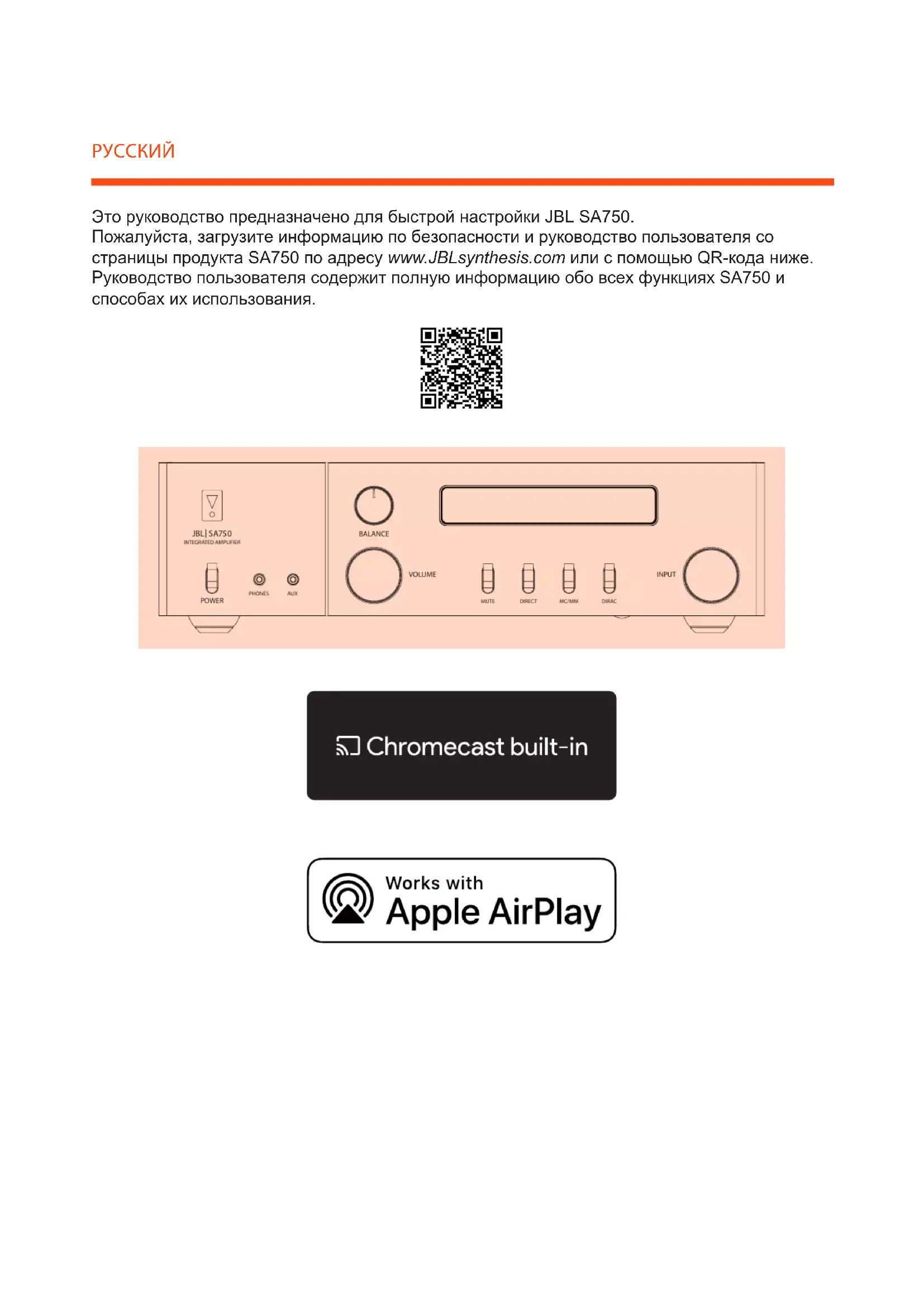 Страна происхождения: Китай Импортер в Россию: OOO “ХАРМАН РУС СиАйЭс“, Россия, 127018, г.Москва, ул. Двинцев, д.12, к 1 Гарантийный период: 5 лет Информация о сервисных центрах: http://harman.club/servicecenters/ +7-800-700-0467 Срок службы: 5 лет Товар сертифицирован Дата производства: Дата изготовления устройства определяется по двум буквенным обозначениям из второй группы символов серийного номера изделия, следующих после разделительного знака «-». Кодировка соответствует порядку букв латинского алфавита, начиная с января 2010 года: 000000-MY0000000, где «M» - месяц производства (А - январь, B - февраль, C - март и т.д.) и «Y» - год производства (A - 2010, B - 2011, C - 2012 и т.д.). Используйте устройство только по прямому назначению в соответствии с предоставленной инструкцией. Не пытайтесь самостоятельно вскрывать корпус товара и осуществлять ремонт. В случае обнаружения недостатков или дефектов, обращайтесь за гарантийным обслуживанием в соответствии с указанной в руководстве пользователя информацией. Особые условия хранения, реализации и (или) транспортировки не предусмотрены. Срок годности не ограничен при соблюдении условий хранения. Избегайте воздействия экстремальных температур, влаги, сильных магнитных полей. Устройство предназначено для работы в жилых зонах.ITALIANO Questa guida ha lo scopo di consentire una rapida congurazione del tuo JBL SA750. Scaricare le informazioni sulla sicurezza e il manuale utente dalla pagina del prodotto SA750 all’indirizzo www.JBLsynthesis.com o tramite il codice QR qui sotto. Il manuale utente contiene i dettagli completi di tutte le funzionalità dell’SA750 e di come utilizzarle. POWER PHONES AUX INTEGRATED AMPLIFIER JBL