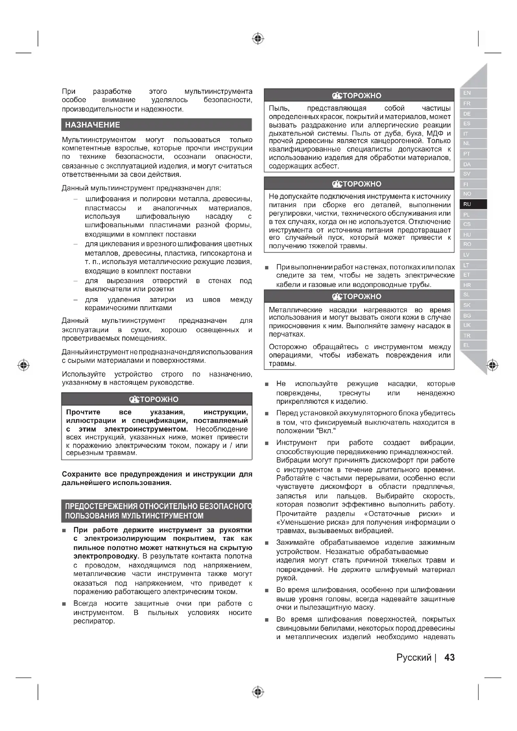 Прочтите все указания, инструкции, иллюстрации и спецификации, поставляемый с этим электроинструментом. Несоблюдение всех инструкций, указанных ниже, может привести к поражению электрическим током, пожару и / или серьезным травмам. Сохраните все предупреждения и инструкции для дальнейшего использования. ПРЕДОСТЕРЕЖЕНИЯ ОТНОСИТЕЛЬНО БЕЗОПАСНОГО ПОЛЬЗОВАНИЯ МУЛЬТИНСТРУМЕНТОМ ■ При работе держите инструмент за рукоятки с электроизолирующим покрытием, так как пильное полотно может наткнуться на скрытую электропроводку. В результате контакта полотна с проводом, находящимся под напряжением, металлические части инструмента также могут оказаться под напряжением, что приведет к поражению работающего электрическим током. ■ Всегда носите защитные очки при работе с инструментом. В пыльных условиях носите респиратор.