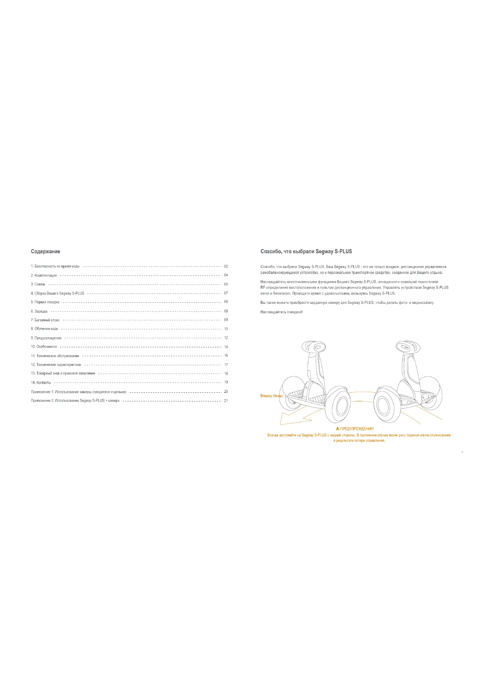 Спасибо, что выбрали Segway S-PLUS Вперед Назад ПРЕДУПРЕЖДЕНИЕ! Всегда заступайте на Segway S-PLUS с задней стороны. В противном случае велик риск падения и/или столкновения в результате потери управления. Спасибо, что выбрали Segway S-PLUS. Ваш Segway S-PLUS - это не только мощное, дистанционно управляемое самобалансирующееся устройство, но и персональное транспортное средство, созданное для Вашего отдыха. Наслаждайтесь многочисленными функциями Вашего Segway S-PLUS, оснащенного новейшей технологией RF-определения местоположения и пультом дистанционного управления. Управлять устройством Segway S-PLUS легко и безопасно. Проводите время с удовольствием, пользуясь Segway S-PLUS. Вы также можете приобрести карданную камеру для Segway S-PLUS, чтобы делать фото- и видеосъёмку. Наслаждайтесь поездкой!02 03 1 Безопасность во время езды 1. Segway S-PLUS является развлекательным средством передвижения. Прежде чем овладеть навыками езды на Segway S-PLUS, Вам нужна практика и тренировки. Ни компания Ninebot Inc., ни компания Segway Inc. не несет ответственности за травмы и ущерб, полученные в результате неопытности пользователя или нарушения им инструкций, приведенных в данном руководстве. 2. Примите во внимание, что Вы сможете снизить риск падения или иных неполадок, следуя всем рекомендациям и предупреждениям, приведенным в данном руководстве, однако Вы не можете избежать всех рискованных ситуаций. Помните, что каждый раз катаясь на Segway S-PLUS, Вы рискуете получить травму от потери контроля, столкновений или падений. При входе в общественные места всегда соблюдайте местные законы и правила. Как и в случае с другими видами транспорта, более высокая скорость требует более длительного торможения. Внезапное торможение на поверхностях с низким сцеплением может привести к скольжению колеса или падению. Будьте осторожны и всегда держите безопасное расстояние между Вами и другими людьми или транспортными средствами во время езды. Будьте внимательны и постарайтесь снизить скорость при въезде на незнакомою территорию. 3. Всегда надевайте шлем во время езды. Используйте одобренный, правильно подобранный шлем для велосипеда или скейтборда с ремешком для подбородка, обеспечивающий защиту задней части головы. 4. Не пытайтесь совершить свою первую поездку на территории, где вы можете столкнуться с детьми, пешеходами, домашними животными, транспортными средствами, велосипедами или другими препятствиями и потенциальными опасностями. 5. Уважайте пешеходов, всегда уступая им право движения. Объезжайте их с левой стороны, когда это возможно. При приближении пешехода спереди, держитесь правой стороны, сбавляя скорость. Старайтесь не пугать пешеходов. При приближении к пешеходам сзади, дайте знать о себе и снижайте скорость до скорости ходьбы. В соответствии с ситуацией соблюдайте местные законы дорожного движения и правила. 6. В местах с отсутствующими законами и правилами, регулирующими управление самобалансирующимися электрическими транспортными средствами, соблюдайте правила безопасности, изложенные в этом руководстве. Ни компания Ninebot Inc., ни компания Segway Inc. не несут ответственности за какой-либо материальный ущерб, телесные повреждения/смерть, несчастные случаи или юридические споры, вызванные в результате нарушений инструкций по технике безопасности. 7. Не позволяйте другим лицам самостоятельно ездить на