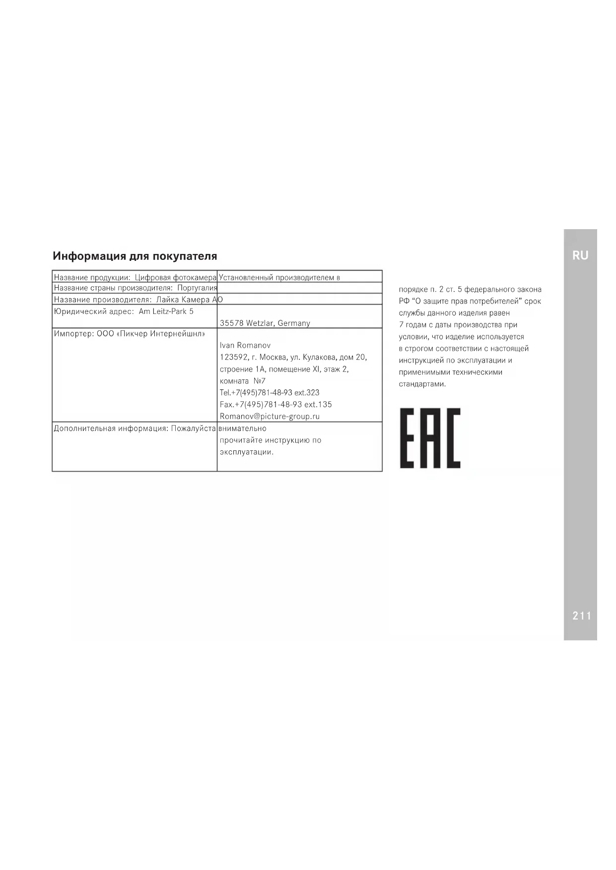 Информация для покупателя Название продукции: Цифровая фотокамера Установленный производителем в порядке п. 2 ст. 5 федерального закона РФ “О защите прав потребителей” срок службы данного изделия равен 7 годам с даты производства при условии, что изделие используется в строгом соответствии с настоящей инструкцией по эксплуатации и применимыми техническими стандартами. Название страны производителя: Португалия Название производителя: Лайка Камера АО Юридический адрес: Am Leitz-Park 5 35578 Wetzlar, Germany Импортер: ООО «Пикчер Интернейшнл» Ivan Romanov 123592, г. Москва, ул. Кулакова, дом 20, строение 1А, помещение XI, этаж 2, комната №7 Тel.+7(495)781-48-93 ext.323 Fax.+7(495)781-48-93 ext.135 Romanov@picture-group.ru Дополнительная информация: Пожалуйста внимательно прочитайте инструкцию по эксплуатации.RU