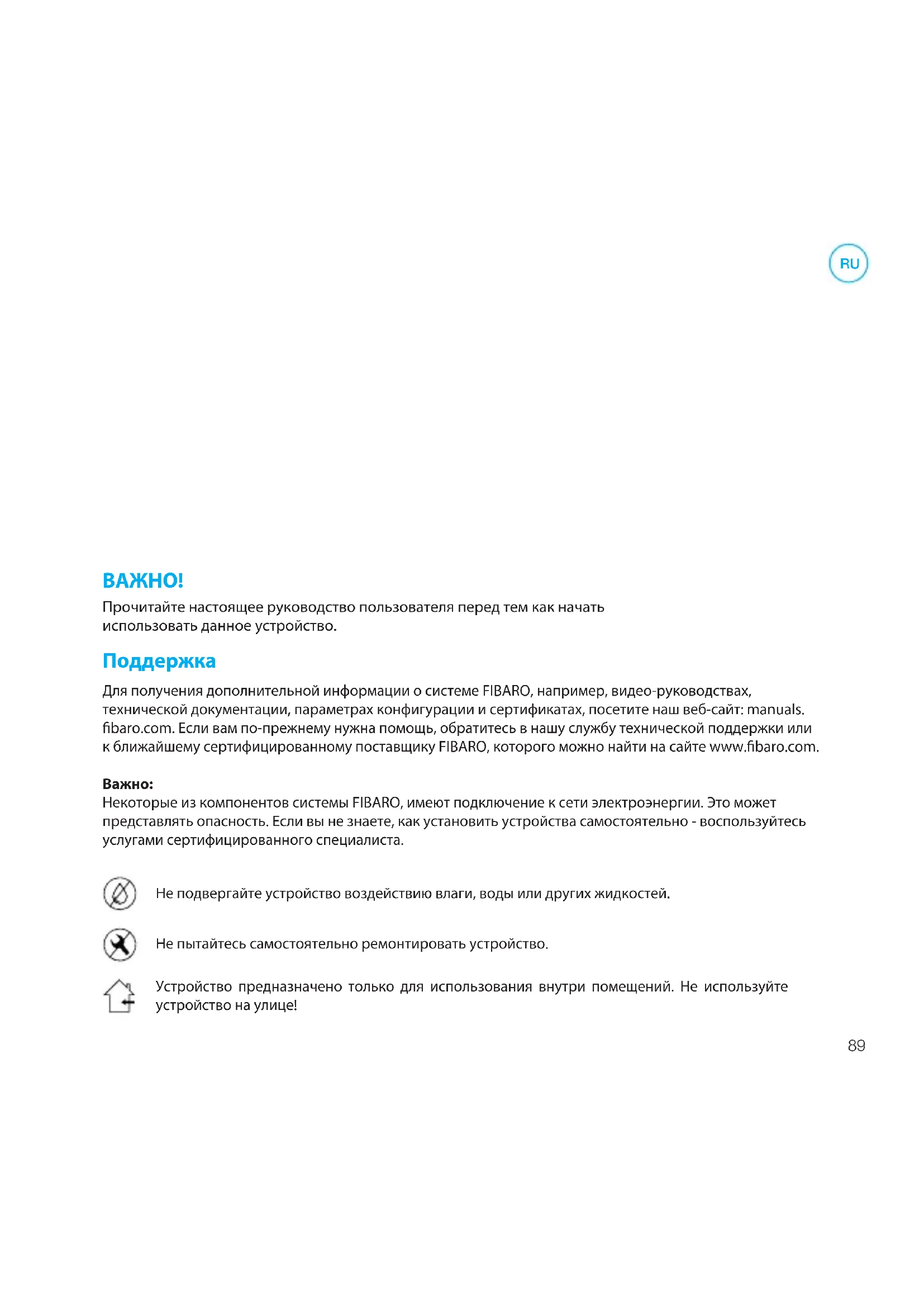 Прочитайте настоящее руководство пользователя перед тем как начать использовать данное устройство. Для получения дополнительной информации о системе FIBARO, например, видео-руководствах, технической документации, параметрах конфигурации и сертификатах, посетите наш веб-сайт: manuals. baro.com. Если вам по-прежнему нужна помощь, обратитесь в нашу службу технической поддержки или к ближайшему сертифицированному поставщику FIBARO, которого можно найти на сайте www.baro.com.