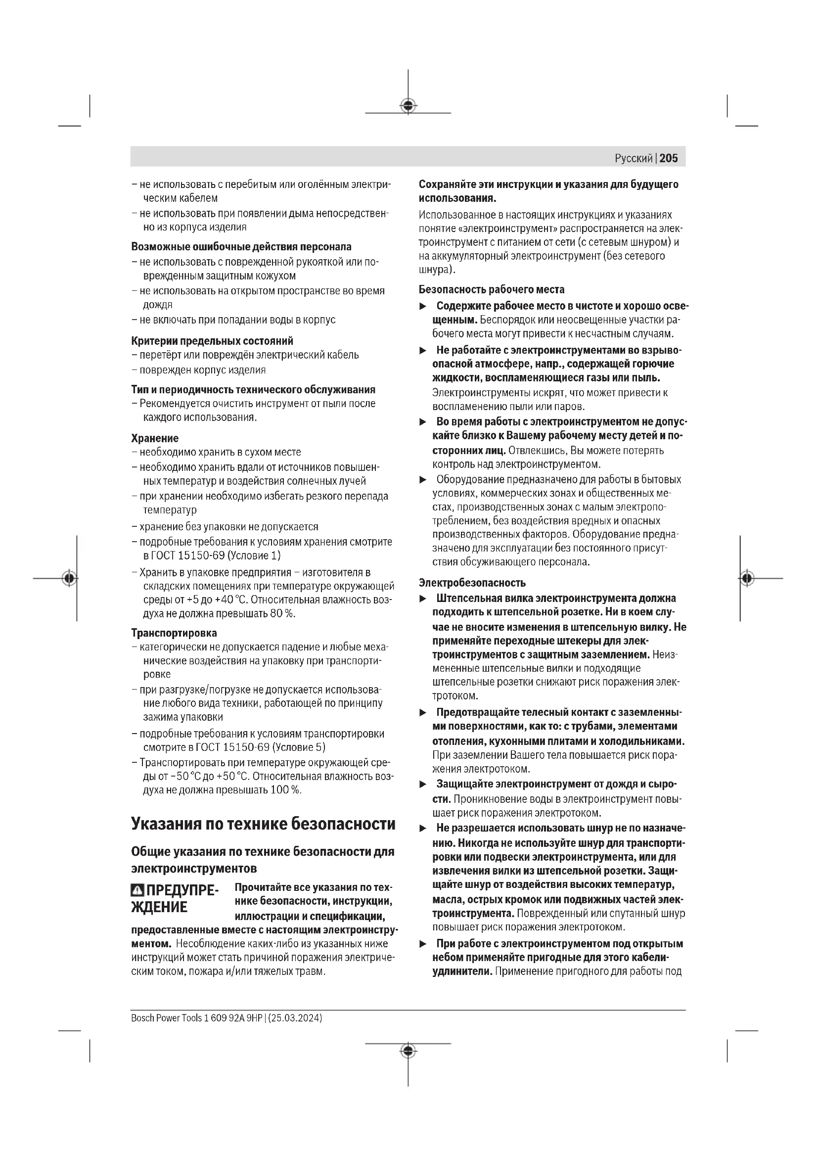 Toлько для стран Евразийского экономического союза (Таможенного союза) В состав эксплуатационных документов, предусмотрен- ных изготовителем для продукции, могут входить настоя- щее руководство по эксплуатации, а также приложения. Информация о подтверждении соответствия содержится в приложении. Информация о стране происхождения указана на корпу- се изделия и в приложении. Дата изготовления указана на последней странице об- ложки Руководства. Контактная информация относительно импортера содер- жится на упаковке. Срок службы изделия Срок службы изделия составляет 7 лет. Не рекомендует- ся к эксплуатации по истечении 5 лет хранения с даты изготовления без предварительной проверки (дату изго- товления см. на этикетке). Указанный срок службы действителен при соблюдении потребителем требований настоящего руководства. Перечень критических отказов – не использовать при сильном искрении – не использовать при появлении сильной вибрации 1 609 92A 9HP | (25.03.2024) Bosch Power ToolsРусский | 205 – не использовать с перебитым или оголённым электри- ческим кабелем – не использовать при появлении дыма непосредствен- но из корпуса изделия Возможные ошибочные действия персонала – не использовать с поврежденной рукояткой или по- врежденным защитным кожухом – не использовать на открытом пространстве во время