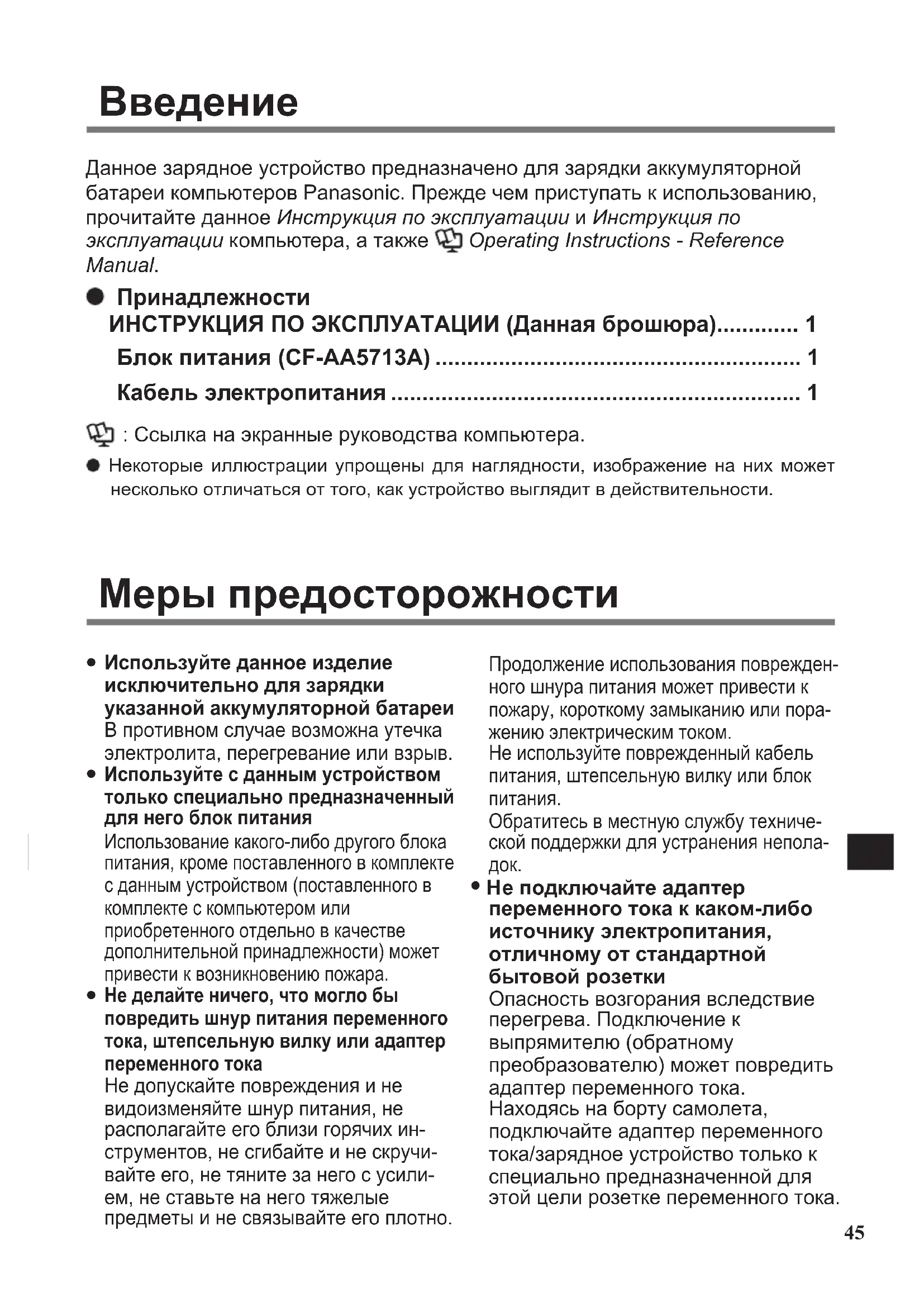 <Iba pre Severnú Ameriku> Sieťový adaptér je kompatibilný so zdrojmi napájania až do 240 V sieťového napájacieho adaptéra. Tento nabíjačka batérií sa dodáva so 125 V kompati- bilným sieťovým káblom. 20-Sk-2-1 Parametre Preventívne opatrenia DHQX1330ZA_T1_VCB331_FM171_OI_17L.indb 44 2017/05/25 14:57:0945 Данное зарядное устройство предназначено для зарядки аккумуляторной батареи компьютеров Panasonic. Прежде чем приступать к использованию, прочитайте данное Инструкция по эксплуатации и Инструкция по эксплуатации компьютера, а также Operating Instructions - Reference Manual. Принадлежности ИНСТРУКЦИЯ ПО ЭКСПЛУАТАЦИИ (Данная брошюра)............. 1 Блок питания (CF-AA5713A) .......................................................... 1 Кабель электропитания ................................................................. 1