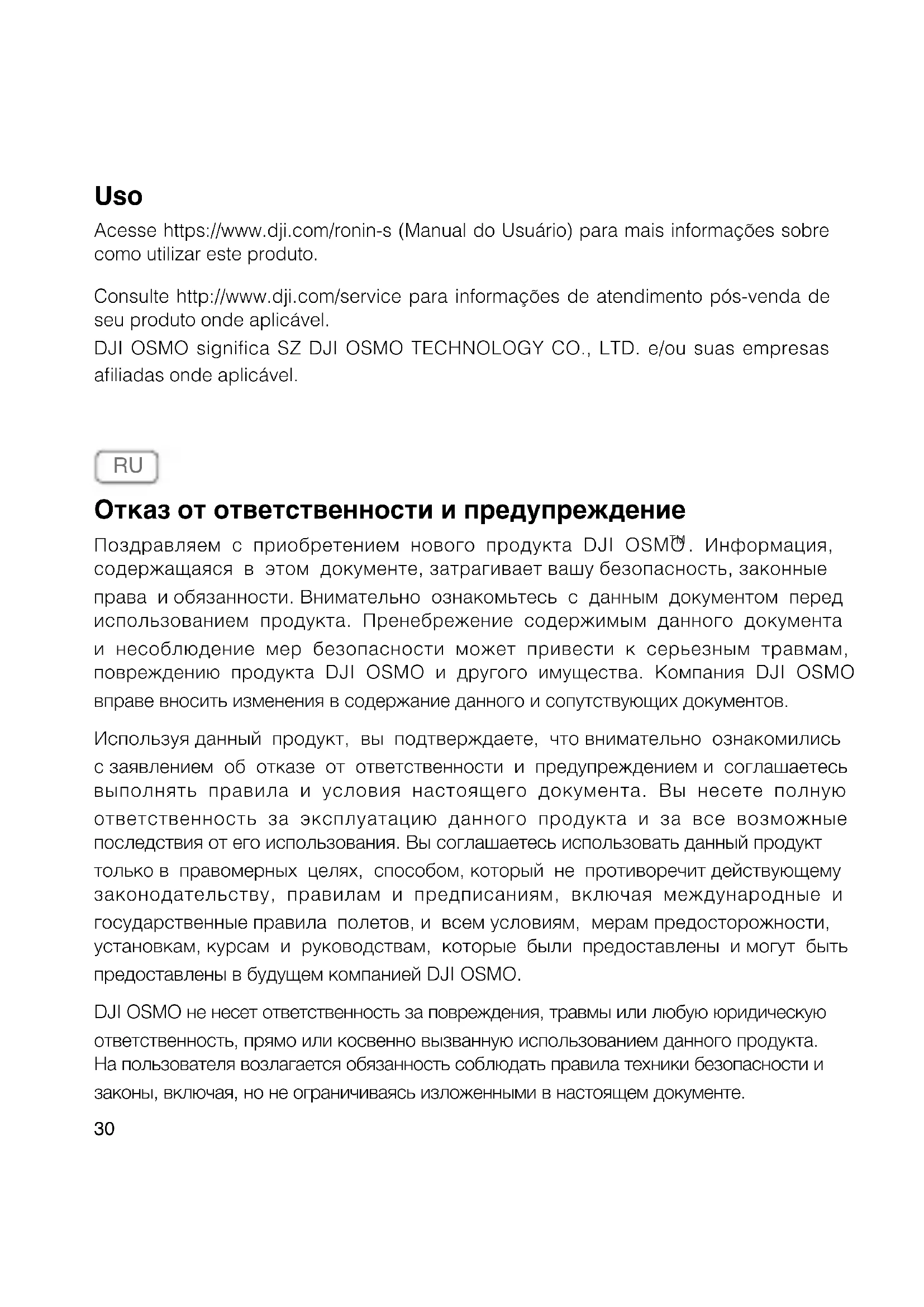 . Информация, содержащаяся в этом документе, затрагивает вашу безопасность, законные права и обязанности. Внимательно ознакомьтесь с данным документом перед использованием продукта. Пренебрежение содержимым данного документа и несоблюдение мер безопасности может привести к серьезным травмам, повреждению продукта DJI OSMO и другого имущества. Компания DJI OSMO вправе вносить изменения в содержание данного и сопутствующих документов. Используя данный продукт, вы подтверждаете, что внимательно ознакомились с заявлением об отказе от ответственности и предупреждением и соглашаетесь выполнять правила и условия настоящего документа. Вы несете полную ответственность за эксплуатацию данного продукта и за все возможные последствия от его использования. Вы соглашаетесь использовать данный продукт только в правомерных целях, способом, который не противоречит действующему законодательству, правилам и предписаниям, включая международные и государственные правила полетов, и всем условиям, мерам предосторожности, установкам, курсам и руководствам, которые были предоставлены и могут быть предоставлены в будущем компанией DJI OSMO. DJI OSMO не несет ответственность за повреждения, травмы или любую юридическую ответственность, прямо или косвенно вызванную использованием данного продукта. На пользователя возлагается обязанность соблюдать правила техники безопасности и законы, включая, но не ограничиваясь изложенными в настоящем документе.31 Независимо от изложенного выше, данное заявление об отказе от ответственности не влияет на законные права клиента, гарантируемые национальным законодательством. OSMO является товарным знаком компании SZ DJI OSMO TECHNOLOGY CO., LTD. (сокращенно "DJI OSMO") и ее дочерних компаний. Названия продуктов, торговых марок и т. д., содержащиеся в данном документе, являются товарными знаками или зарегистрированными товарными знаками соответствующих компаний. Этот продукт и документ DJI OSMO охраняются авторским правом. Все права защищены. Никакая часть данного продукта или документа не может быть воспроизведена в любой форме без предварительного письменного согласия или разрешения DJI OSMO.