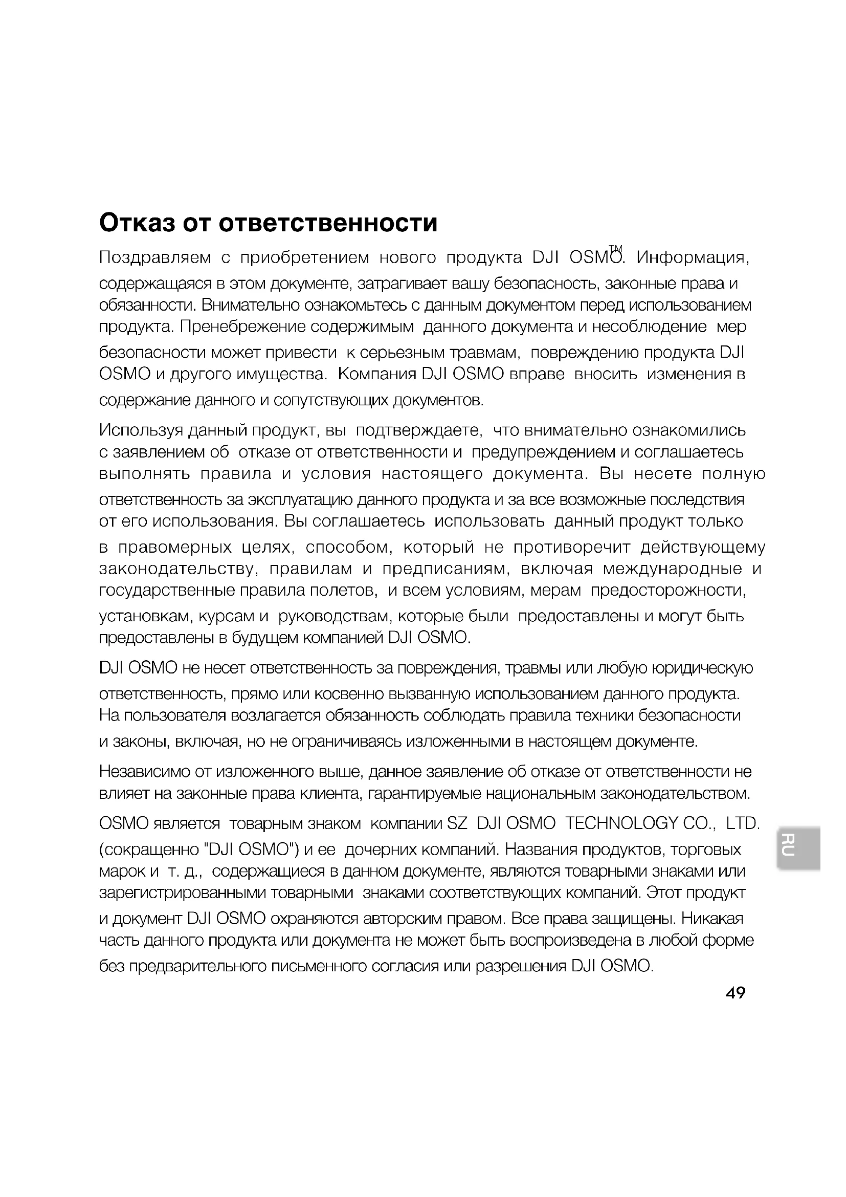 . Информация, содержащаяся в этом документе, затрагивает вашу безопасность, законные права и обязанности. Внимательно ознакомьтесь с данным документом перед использованием продукта. Пренебрежение содержимым данного документа и несоблюдение мер безопасности может привести к серьезным травмам, повреждению продукта DJI OSMO и другого имущества. Компания DJI OSMO вправе вносить изменения в содержание данного и сопутствующих документов. Используя данный продукт, вы подтверждаете, что внимательно ознакомились с заявлением об отказе от ответственности и предупреждением и соглашаетесь выполнять правила и условия настоящего документа. Вы несете полную ответственность за эксплуатацию данного продукта и за все возможные последствия от его использования. Вы соглашаетесь использовать данный продукт только в правомерных целях, способом, который не противоречит действующему законодательству, правилам и предписаниям, включая международные и государственные правила полетов, и всем условиям, мерам предосторожности, установкам, курсам и руководствам, которые были предоставлены и могут быть предоставлены в будущем компанией DJI OSMO. DJI OSMO не несет ответственность за повреждения, травмы или любую юридическую ответственность, прямо или косвенно вызванную использованием данного продукта. На пользователя возлагается обязанность соблюдать правила техники безопасности и законы, включая, но не ограничиваясь изложенными в настоящем документе. Независимо от изложенного выше, данное заявление об отказе от ответственности не влияет на законные права клиента, гарантируемые национальным законодательством. OSMO является товарным знаком компании SZ DJI OSMO TECHNOLOGY CO., LTD. (сокращенно "DJI OSMO") и ее дочерних компаний. Названия продуктов, торговых марок и т. д., содержащиеся в данном документе, являются товарными знаками или зарегистрированными товарными знаками соответствующих компаний. Этот продукт и документ DJI OSMO охраняются авторским правом. Все права защищены. Никакая часть данного продукта или документа не может быть воспроизведена в любой форме без предварительного письменного согласия или разрешения DJI OSMO.50