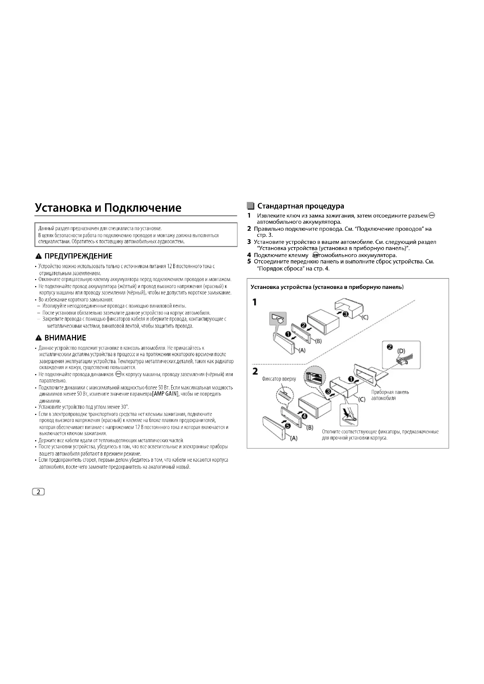 Установка и Подключение Данный раздел предназначен для специалиста по установке. В целях безопасности работа по подключению проводов и монтажу должна выполняться специалистами. Обратитесь к поставщику автомобильных аудиосистем. ПРЕДУПРЕЖДЕНИЕ