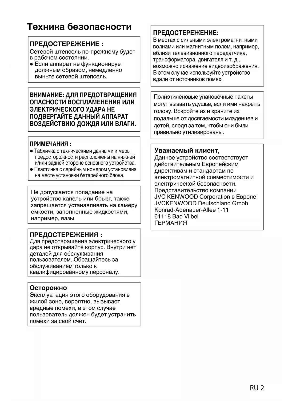 Уважаемый клиент, Данное устройство соответствует действительным Европейским директивам и стандартам по электромагнитной совместимости и электрической безопасности. Представительство компании JVC KENWOOD Corporation в Европе: JVCKENWOOD Deutschland Gmbh Konrad-Adenauer-Allee 1-11 61118 Bad Vilbel