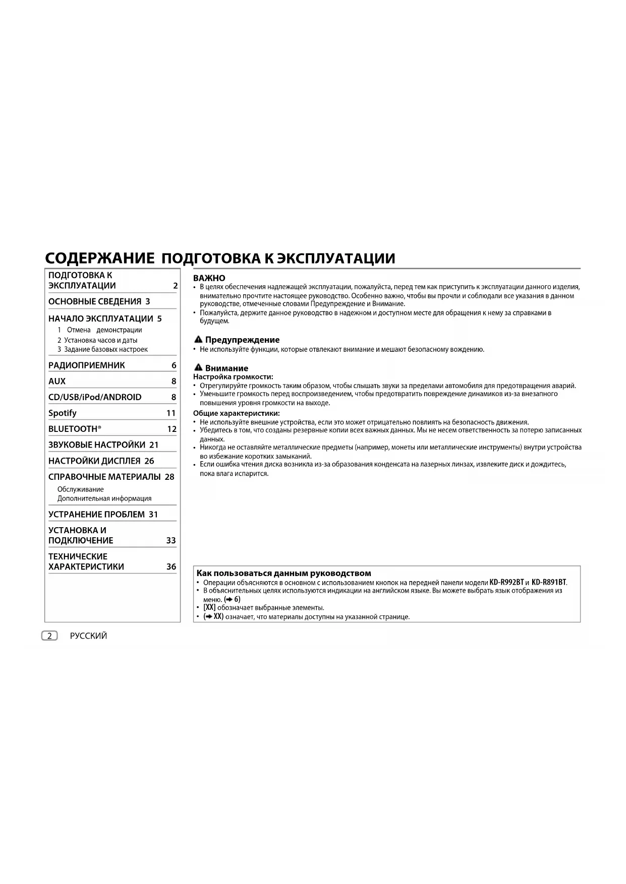 Если ошибка чтения диска возникла из-за образования конденсата на лазерных линзах, извлеките диск и дождитесь, пока влага испарится. ПОДГОТОВКА К ЭКСПЛУАТАЦИИ 2 ОСНОВНЫЕ СВЕДЕНИЯ 3 НАЧАЛО ЭКСПЛУАТАЦИИ 5 1 Отмена демонстрации 2 Установка часов и даты 3 Задание базовых настроек РАДИОПРИЕМНИК 6 AUX 8 CD/USB/iPod/ANDROID 8 Spotify 11 BLUETOOTH® 12 ЗВУКОВЫЕ НАСТРОЙКИ 21 НАСТРОЙКИ ДИСПЛЕЯ 26 СПРАВОЧНЫЕ МАТЕРИАЛЫ 28 Обслуживание Дополнительная информация УСТРАНЕНИЕ ПРОБЛЕМ 31 УСТАНОВКА И ПОДКЛЮЧЕНИЕ 33 ТЕХНИЧЕСКИЕ ХАРАКТЕРИСТИКИ 36 Как пользоваться данным руководством