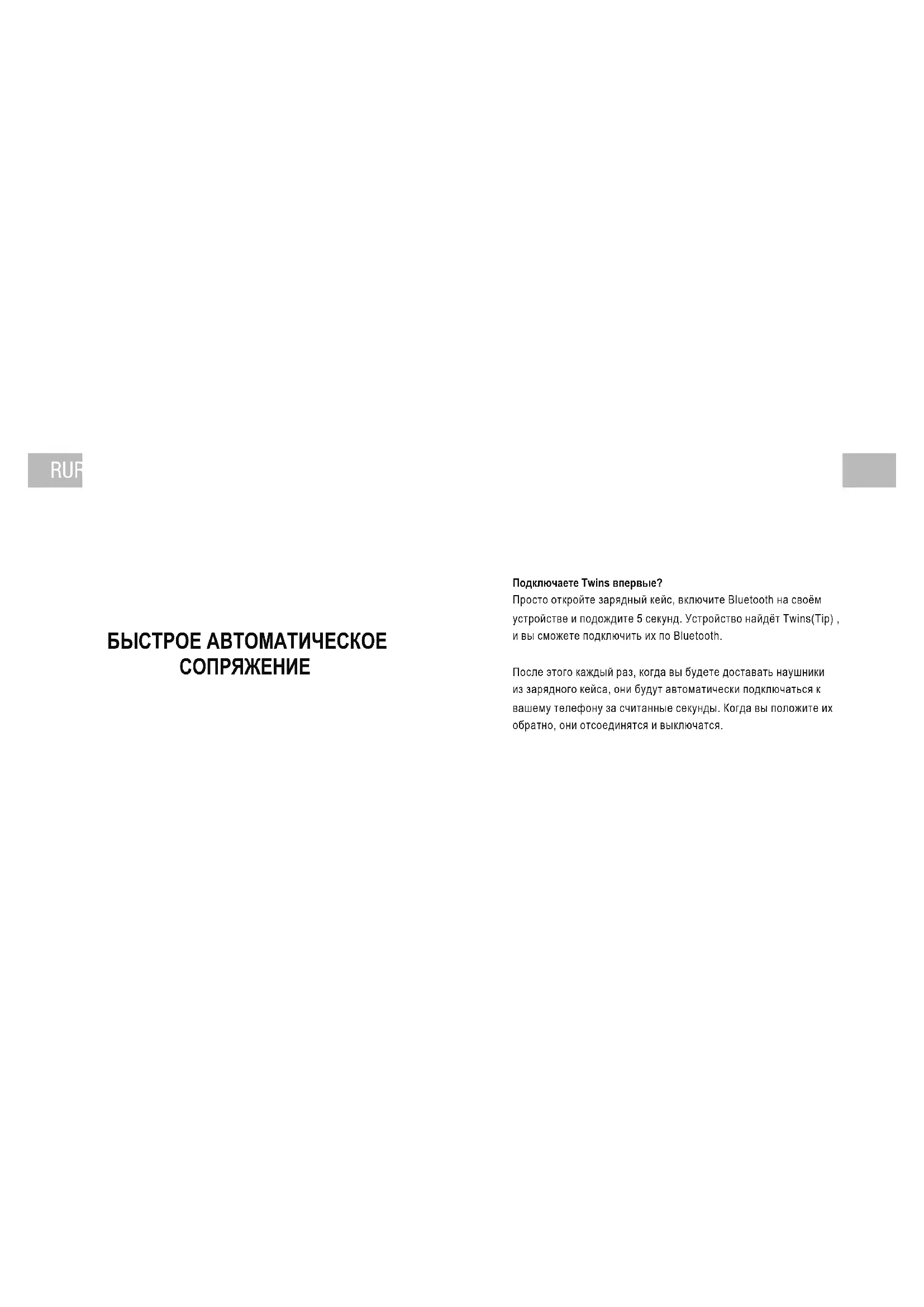 ΠΏΣ ΝΑ ΚΑΝΕΤΕ ΕΠΑΝΑΦΟΡΑRU RU Подключаете Twins впервые? Просто откройте зарядный кейс, включите Bluetooth на своём устройстве и подождите 5 секунд. Устройство найдёт Twins(Tip) , и вы сможете подключить их по Bluetooth. После этого каждый раз, когда вы будете доставать наушники из зарядного кейса, они будут автоматически подключаться к вашему телефону за считанные секунды. Когда вы положите их обратно, они отсоединятся и выключатся. БЫСТРОЕ АВТОМАТИЧЕСКОЕ СОПРЯЖЕНИЕRU RU Голосовой помощник Предыдущий трек Следующий трек Воспроизведение/пауза