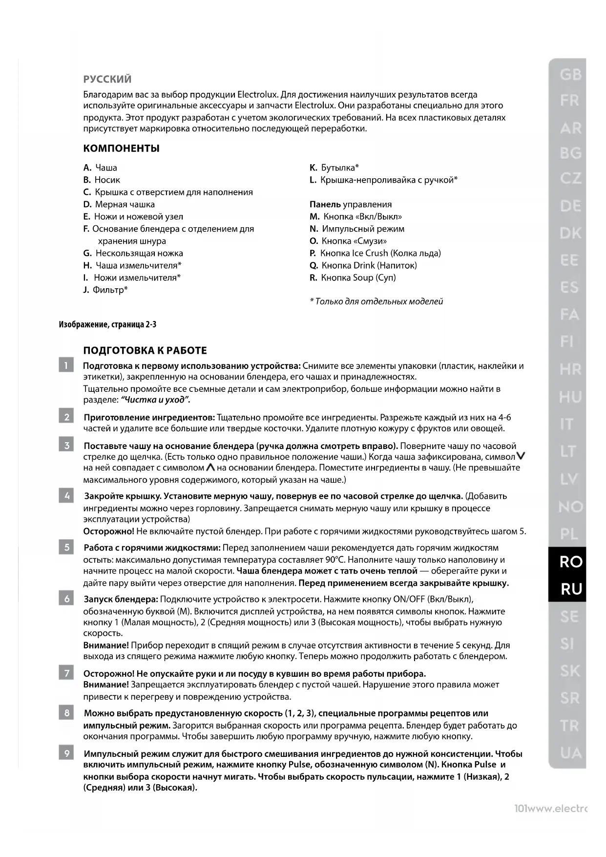 Внимание! Прибор переходит в спящий режим в случае отсутствия активности в течение 5 секунд. Для выхода из спящего режима нажмите любую кнопку. Теперь можно продолжить работать с блендером. 7 Осторожно! Не опускайте руки и ли посуду в кувшин во время работы прибора. Внимание! Запрещается эксплуатировать блендер с пустой чашей. Нарушение этого правила может привести к перегреву и повреждению устройства. 8 Можно выбрать предустановленную скорость (1, 2, 3), специальные программы рецептов или импульсный режим. Загорится выбранная скорость или программа рецепта. Блендер будет работать до окончания программы. Чтобы завершить любую программу вручную, нажмите любую кнопку. 9 Импульсный режим служит для быстрого смешивания ингредиентов до нужной консистенции. Чтобы включить импульсный режим, нажмите кнопку Pulse, обозначенную символом (N). Кнопка Pulse и кнопки выбора скорости начнут мигать. Чтобы выбрать скорость пульсации, нажмите 1 (Низкая), 2 (Средняя) или 3 (Высокая).102 www.electrolux.com 10 Устройство поддерживает множество рецептурных программ. : « » (P), «»* (Q), «» (O) «» (R) (* ).