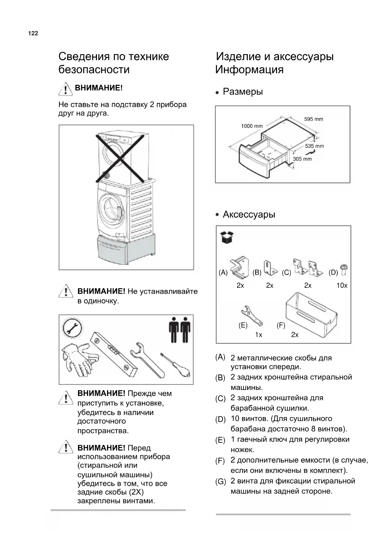 ВНИМАНИЕ! Прежде чем приступить к установке, убедитесь в наличии достаточного пространства. ВНИМАНИЕ! Перед использованием прибора (стиральной или сушильной машины) убедитесь в том, что все задние скобы (2X) закреплены винтами. (A) (B) (C) (D) (E) (F) (G) 2 металлические скобы для установки спереди. 2 задних кронштейна стиральной машины. 2 задних кронштейна для барабанной сушилки. 10 винтов. (Для сушильного барабана достаточно 8 винтов). 1 гаечный ключ для регулировки ножек. 2 дополнительные емкости (в случае, если они включены в комплект). 2 винта для фиксации стиральной машины на задней стороне. 1000 mm 595 mm 535 mm 305 mm123