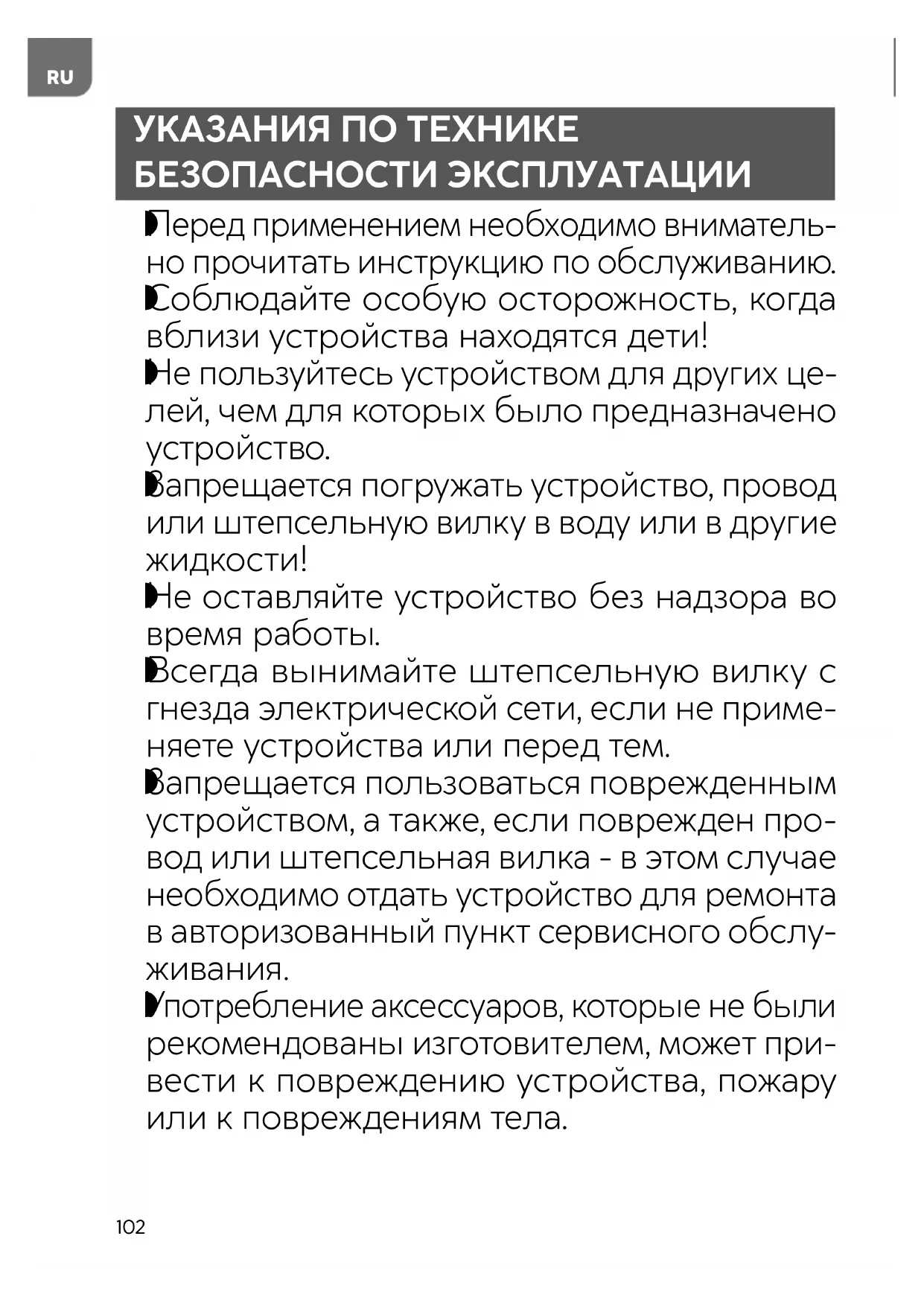 Настоящее устройство может использо- ваться детьми в возрасте от 8 лет, лицами с ограниченными физическими, умственны- ми способностями и лицами с недостат- ком опыта и знаний об устройстве, если обеспечен надзор за ними или если они были предварительно проинструктирова-104