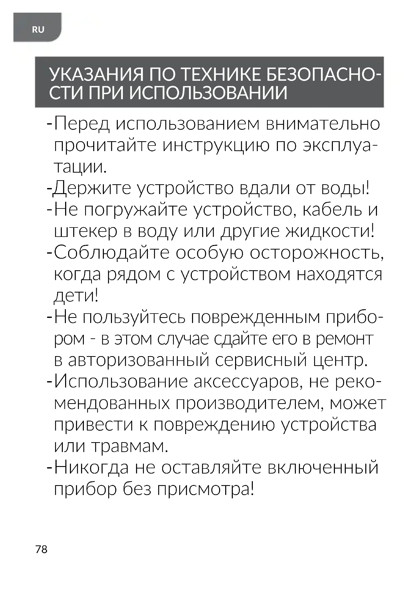 Не погружайте устройство, кабель и штекер в воду или другие жидкости!