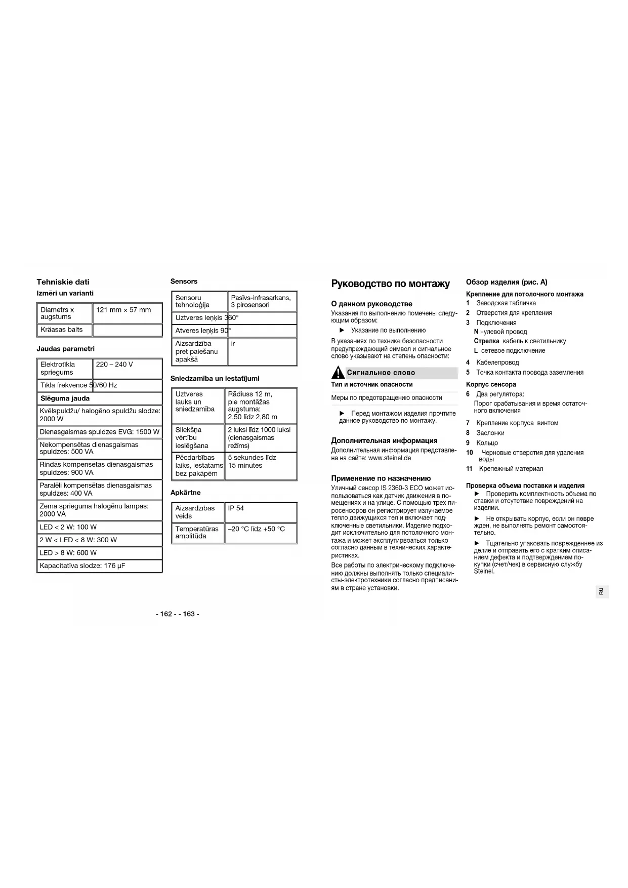 Сигнальное слово Тип и источник опасности Меры по предотвращению опасности ► Перед монтажом изделия прочтите данное руководство по монтажу. Дополнительная информация Дополнительная информация представле- на на сайте: www.steinel.de Применение по назначению Уличный сенсор IS 2360-3 ECO может ис- пользоваться как датчик движения в по- мещениях и на улице. С помощью трех пи- росенсоров он регистрирует излучаемое тепло движущихся тел и включает под
