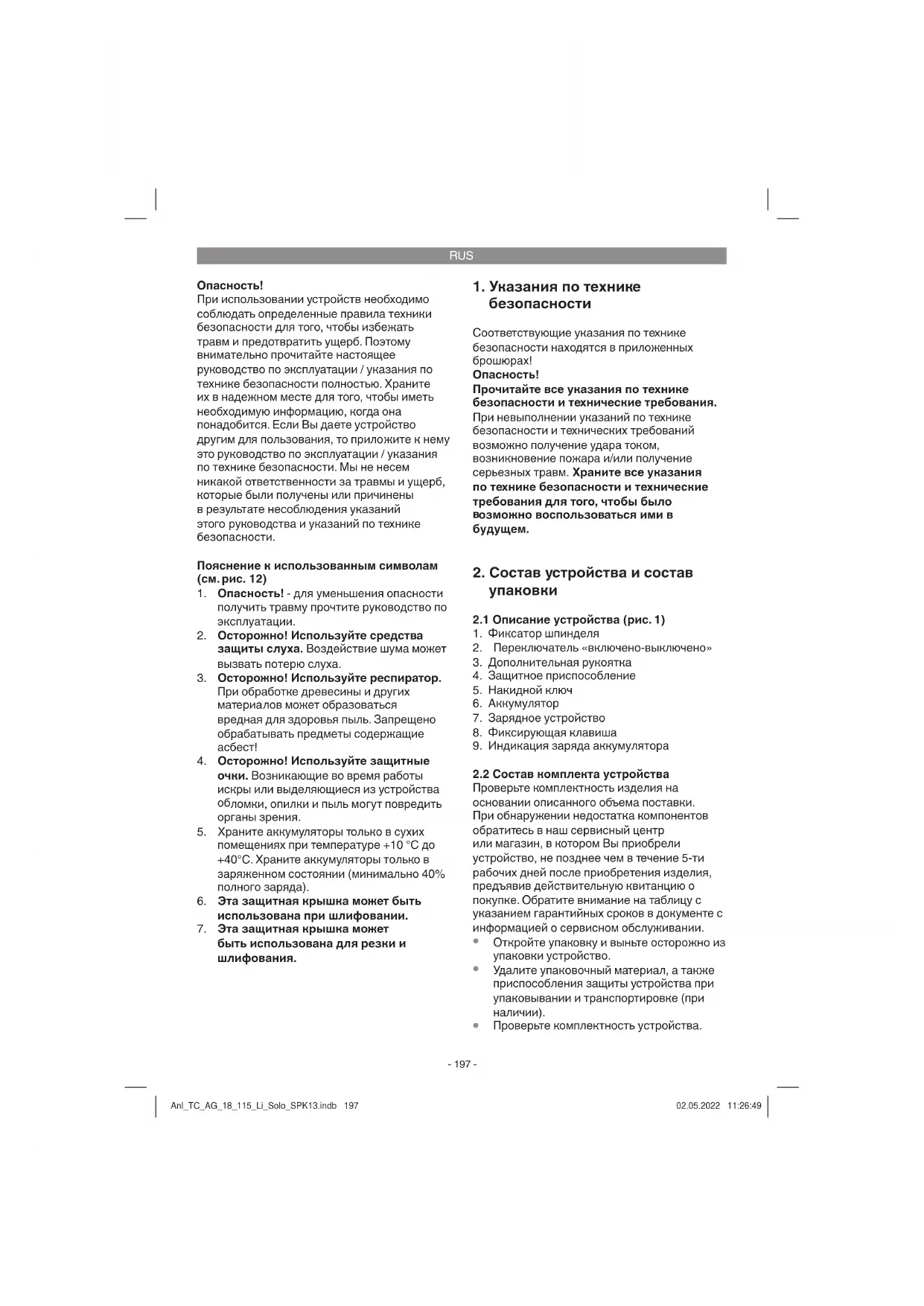 тор заряда аккумулятора (рис. 1c, поз. 9) Нажмите кнопку индикации заряда аккумулятора (a) . Индикатор заряда аккумулятора (9) покажет Вам уровень заряда аккумулятора при помощи 3-х светодиодов. Горят все 3 светодиода: Аккумулятор полностью заряжен. Горят 2 или 1 светодиод: Остаточный заряд аккумулятора достаточен. Anl_TC_AG_18_115_Li_Solo_SPK13.indb 200Anl_TC_AG_18_115_Li_Solo_SPK13.indb 200 02.05.2022 11:26:4902.05.2022 11:26:49RUS