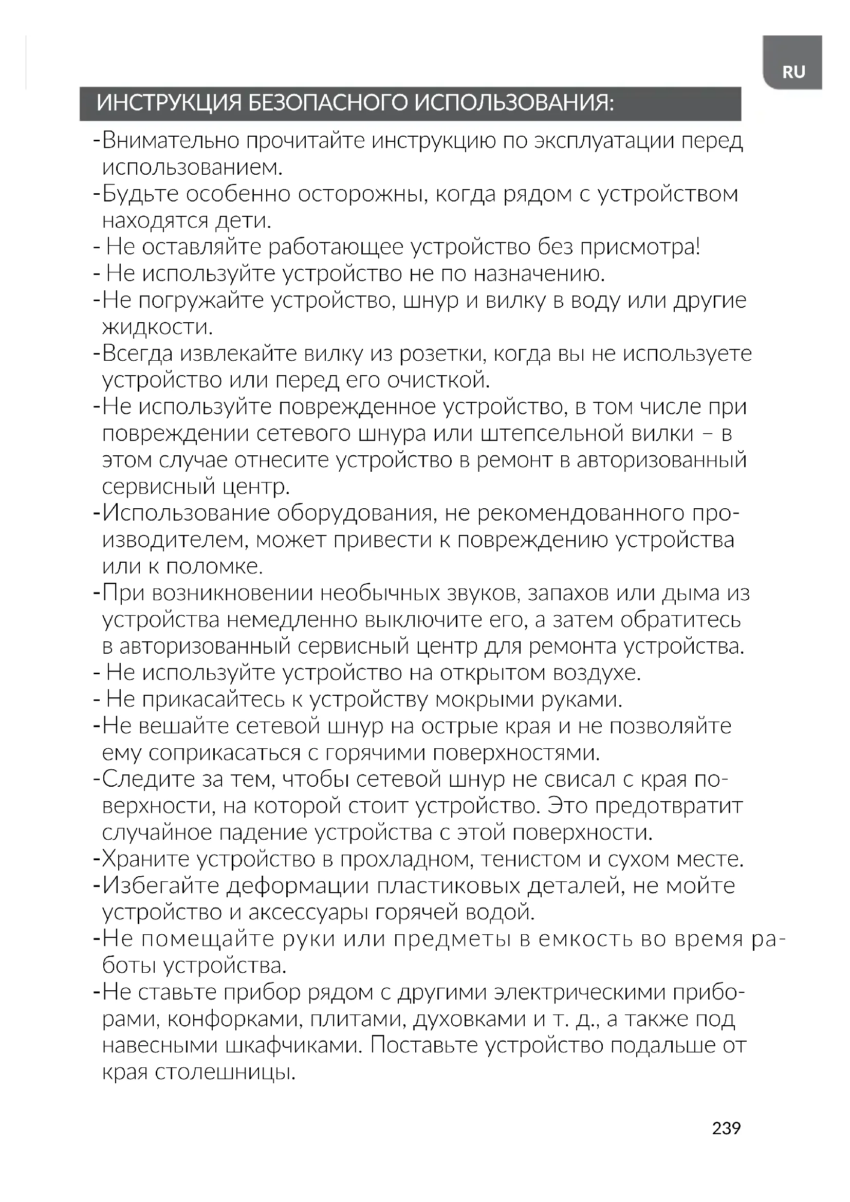 Не ставьте прибор рядом с другими электрическими прибо- рами, конфорками, плитами, духовками и т. д., а также под навесными шкафчиками. Поставьте устройство подальше от края столешницы.240