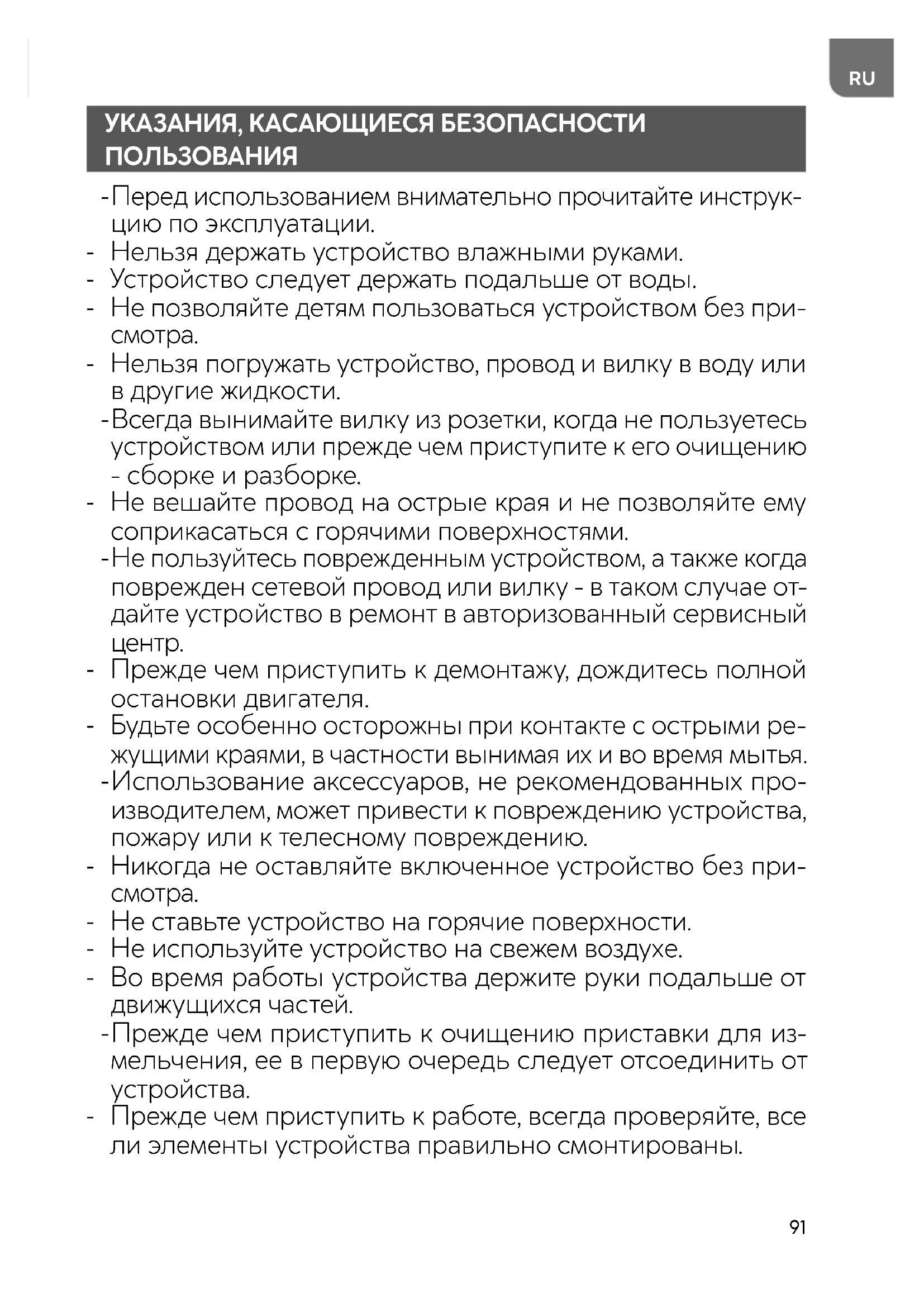 - Не ставьте устройство на горячие поверхности. - Не используйте устройство на свежем воздухе. - Во время работы устройства держите руки подальше от движущихся частей.