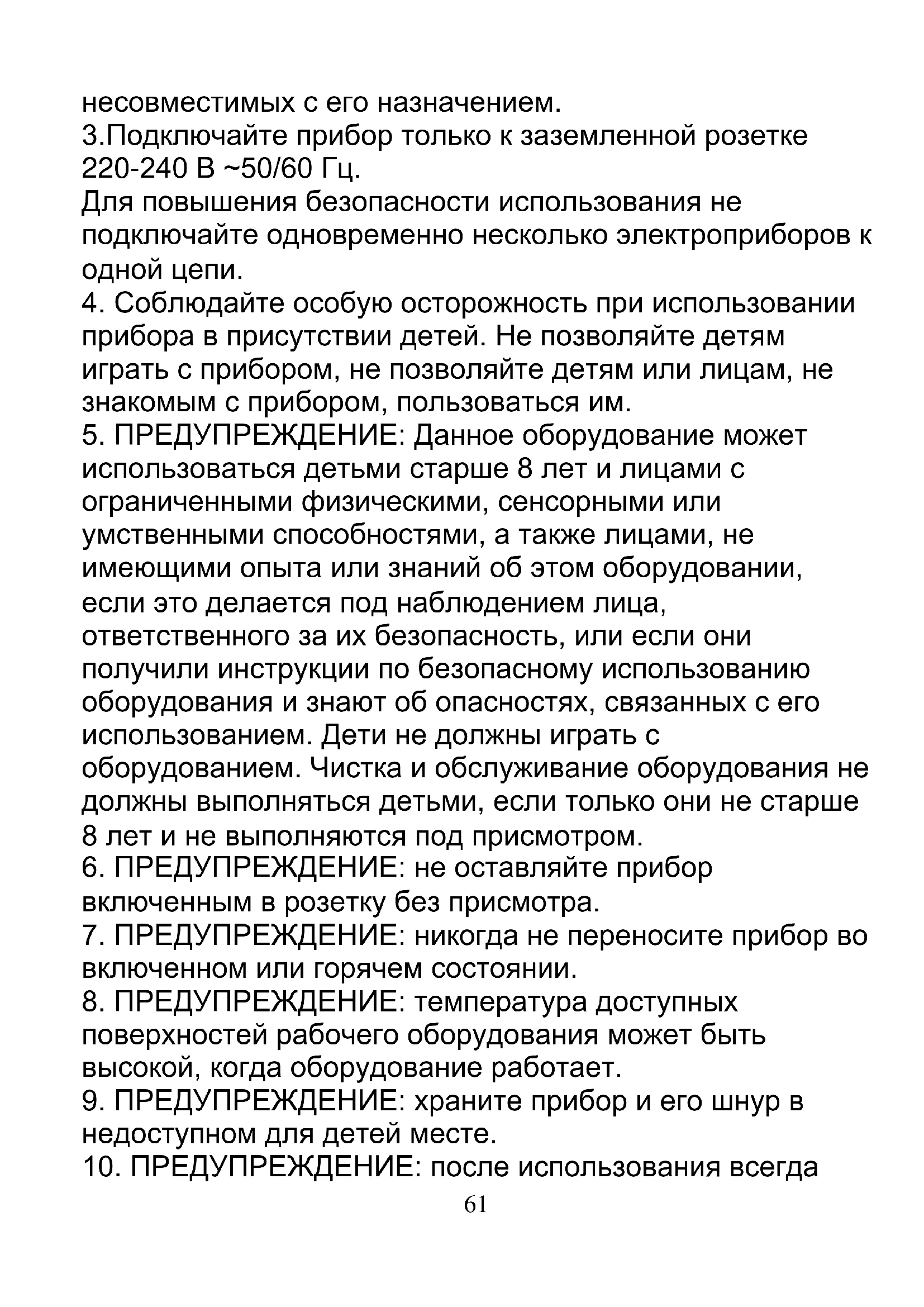 использования. Не используйте его для других целей,61 несовместимых с его назначением. 3.Подключайте прибор только к заземленной розетке 220-240 В ~50/60 Гц. Для повышения безопасности использования не подключайте одновременно несколько электроприборов к одной цепи.