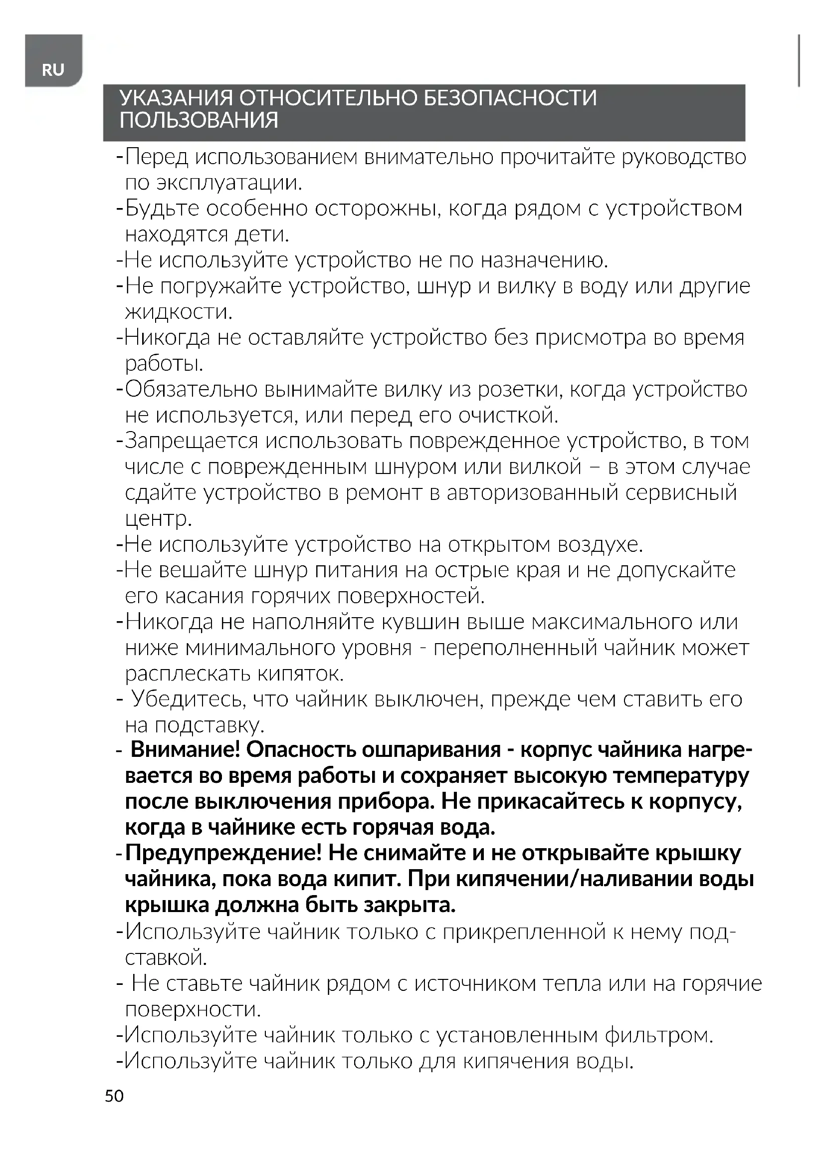 Внимание! Опасность ошпаривания - корпус чайника нагре- вается во время работы и сохраняет высокую температуру после выключения прибора. Не прикасайтесь к корпусу, когда в чайнике есть горячая вода.