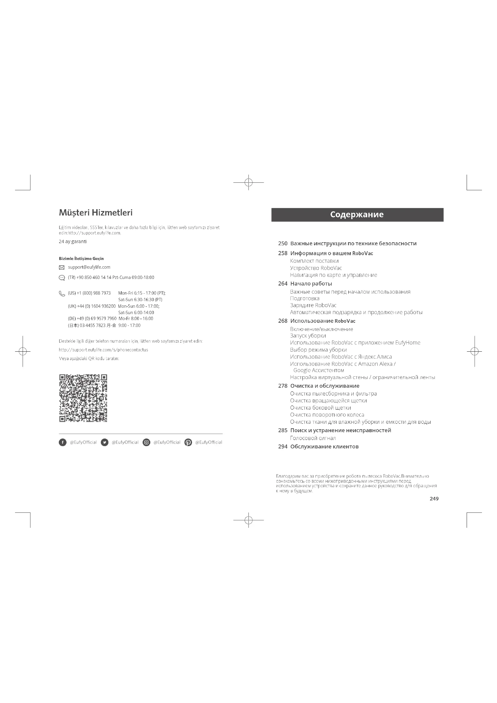 Pусский Dank u voor uw aankoop van de RoboVac.Lees alle onderstaande instructies aandachtig door voordat u dit apparaat gebruikt en bewaar de handleiding, zodat u deze later nogmaals kunt raadplegen. Inhoudsopgave Обслуживаниеклиентов Для просмотра обучающих видеороликов, получения ответов на часто задаваемые вопросы, ознакомления с руководствами и ознакомления с дополнительной информацией посетите веб-страницу: http://support.eufylife.com. Свяжитесь с нами support@eufylife.com (US) +1 (800) 988 7973 Mon-Fri 6:15 - 17:00 (PT); Sat-Sun 6:30-16:30 (PT) (UK) +44 (0) 1604 936200 Mon-Sun 6:00 - 17:00; Sat-Sun 6:00-14:00 (DE) +49 (0) 69 9579 7960 Mo-Fr 8:00 - 16:00 (日本) 03 4455 7823 月-金 9:00 - 17:00 www.eufylife.com Другие номера службы поддержки см. на веб-странице: http://support.eufylife.com/s/phonecontactus Или отсканируйте этот QR-код. Гарантия: 1 год Срок службы: 2 года Компания Anker Innovations Limited Офис 1318-19, Голливуд Плаза, 610 Натан Роуд, Могкок, Коулун, Гонконг (Room 1318-19, Hollywood Plaza, 610 Nathan Road, Mongkok, Kowloon, Hong Kong) 296 Belangrijke veiligheidsinstructies 303 Over uw RoboVac