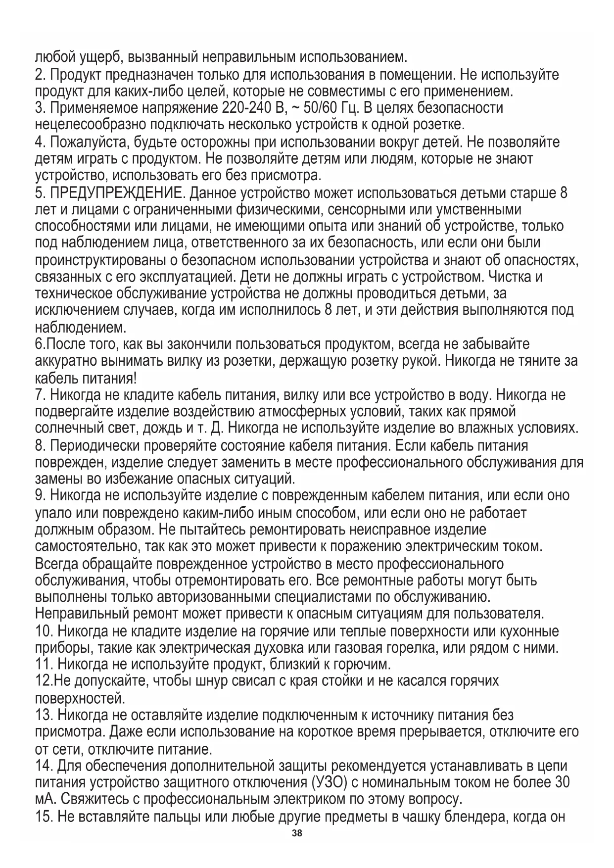 ЧИСТКА И ОБСЛУЖИВАНИЕ ВНИМАНИЕ: Никогда не погружайте корпус блендера (1D) в воду или другие жидкости. ВНИМАНИЕ: Не мойте детали блендера в посудомоечных машинах. БЕЗОПАСНОСТЬ ВНИМАНИЕ: Не допускайте непрерывной работы блендера дольше 60 секунд. ВНИМАНИЕ: Режим пульсации: при перемещении пульсирующей кнопки (2A) блендер внезапно начинает перемешивание с максимальной скоростью. Блендер имеет два предохранительных выключателя. Один в ручке блендера и второй в основании блендера. Всегда проверяйте, правильно ли установлены крышка (1B) и чашка (1C) на чашу блендера (1G) и корпус (1D). Если нет, блендер не начнет работать. Во время процесса смешивания, когда крышка (1B) открыта, машина перестанет работать. Если блендер перегружен, двигатель остановится. Подождите около 45 минут, пока мотор остынет. Этот блендер не подходит для измельчения. Напряжение: 220-240 В ~ 50/60 Гц Максимальное время непрерывной работы: 60 секунд ТЕХНИЧЕСКИЕ ДАННЫЕ Минимальное время перерыва между рабочими циклами: 3 минуты Мощность: 500 Вт Заботясь об окружающей среде.. Упаковку из картона передайте,пожалуйста, на макулатуру. Полиэтиленовые мешки (РЕ) выкидать в резервуар для пластмассы. Изношенное устройство надо передать в соответствующую точку хранения, так как находящиесяв устройствеопасные составляющие могут являться угрозой для окружающей среды. Электрическое устройство надо передать таким образом, чтобы ограничить его повторное употребление и использование. Если в устройстве находятся батареи, их надо вытянуть и передать в точку хранения отдельно. Устройство не выкидать в резервуар для коммунальных отходов! NEDERLANDS 5.WAARSCHUWING: Dit apparaat kan worden gebruikt door kinderen ouder dan 8 jaar en personen met verminderde fysieke, sensorische of mentale vermogens, of personen zonder ervaring of kennis van het apparaat, alleen onder toezicht van een persoon die verantwoordelijk is voor hun veiligheid, of als ze zijn geïnstrueerd over het veilige gebruik van het apparaat en zich bewust zijn van de gevaren die aan het gebruik verbonden zijn. Kinderen mogen niet met het apparaat spelen. Reiniging en onderhoud van het apparaat mogen niet door kinderen worden uitgevoerd, tenzij ze ouder zijn dan 8 jaar en deze activiteiten worden uitgevoerd onder toezicht.