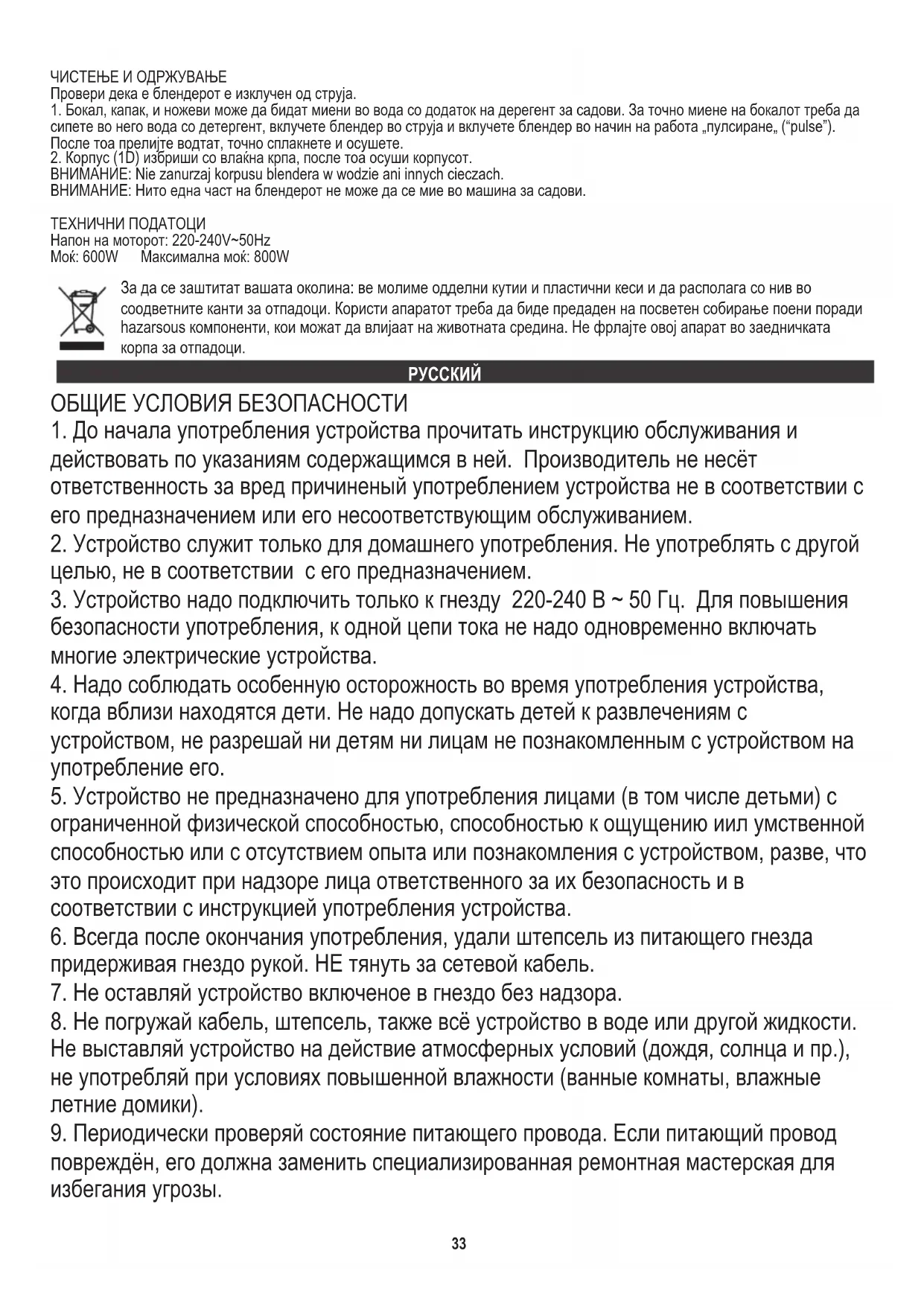 ВНИМАНИЕ: Не опускайте корпус блендера в воду или другие жидкости. Мощность: 600 Вт ВНИМАНИЕ: Никакие части блендера нельзя мыть в посудомоечной машине. ТЕХНИЧЕСКИЕ ПАРАМЕТРЫ Максимальная мощность: 800 Вт Питание: 220-240В~50Гц