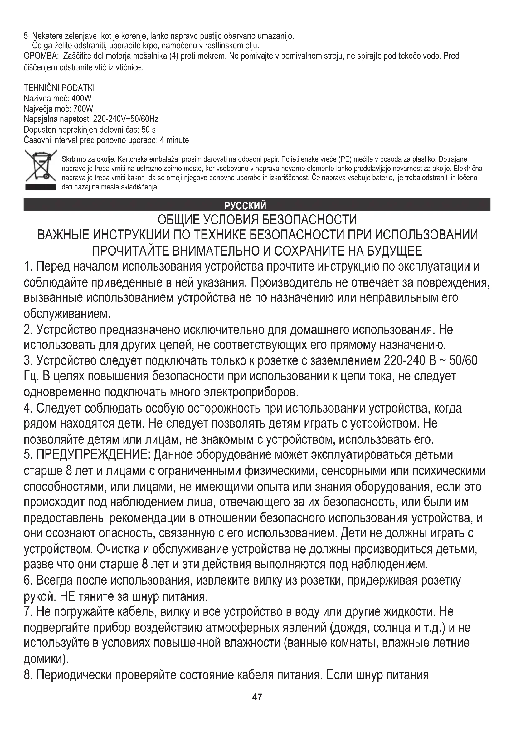 инструментов. ТЕХНИЧЕСКИЕ ДАННЫЕ Номинальная мощность: 400 Вт ВНИМАНИЕ: Защищать моторную часть блендера (4) от намокания. Не мыть в посудомоечной машине, не промывать под проточной водой. Перед тем, как приступить к очистке, вытащить штепсель из розетки.