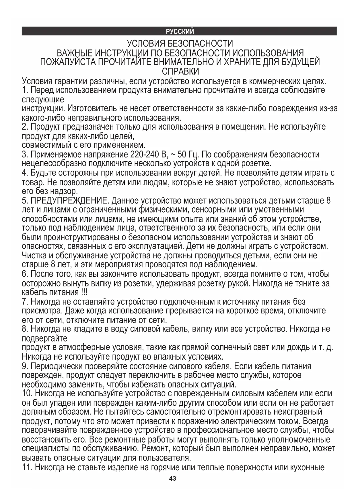 8. Никогда не кладите в воду силовой кабель, вилку или все устройство. Никогда не
