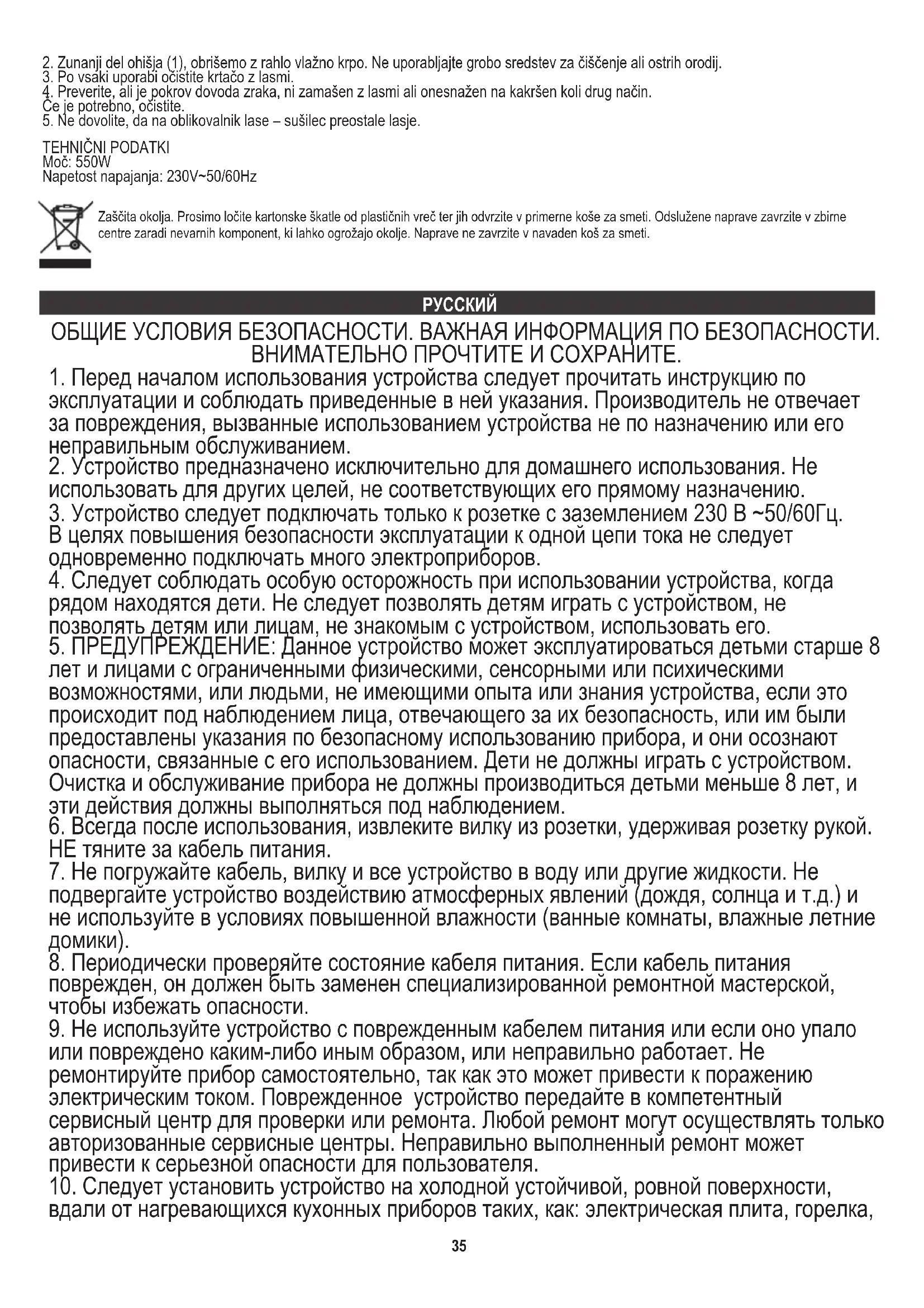 36Заботясь об окружающей среде.. Упаковку из картона передайте,пожалуйста, на макулатуру. Полиэтиленовые мешки (РЕ) выкидать в резервуар для пластмассы. Изношенное устройство надо передать в соответствующую точку хранения, так как находящиесяв устройствеопасные составляющие могут являться угрозой для окружающей среды. Электрическое устройство надо передать таким образом, чтобы ограничить его повторное употребление и использование. Если в устройстве находятся батареи, их надо вытянуть и передать в точку хранения отдельно. Устройство не выкидать в резервуар для коммунальных отходов! SLOVENŠČINA HRVATSKI