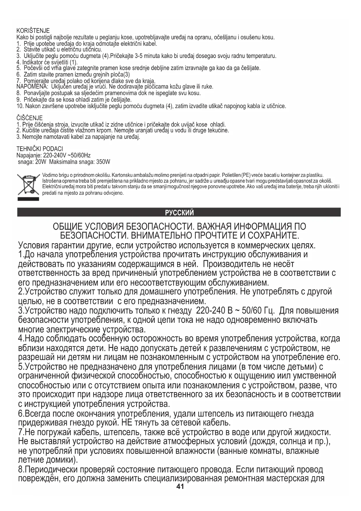 Napajanje: 220-240V ~50/60Hz snaga: 20W Maksimalna snaga: 350W Vodimo brigu o prirodnom okolišu. Kartonsku ambalažu molimo prenijeti na otpadni papir. Polietilen (PE) vreće bacati u kontejner za plastiku. Istrošena oprema treba biti premještena na prikladno mjesto za pohranu, jer sadrže u ureađju opasne tvari mogu predstavljati opasnost za okoliš. Električni uređaj mora biti predat u takvom stanju da se smanji mogučnost njegove ponovne upotrebe. Ako vaš uređaj ima baterije, treba njih ukloniti i predati na mjesto za pohranu odvojeno. ОБЩИЕ УСЛОВИЯ БЕЗОПАСНОСТИ. ВАЖНАЯ ИНФОРМАЦИЯ ПО БЕЗОПАСНОСТИ. ВНИМАТЕЛЬНО ПРОЧТИТЕ И СОХРАНИТЕ. Условия гарантии другие, если устройство используется в коммерческих целях. 1.До начала употребления устройства прочитать инструкцию обслуживания и действовать по указаниям содержащимся в ней. Производитель не несёт ответственность за вред причиненый употреблением устройства не в соответствии с его предназначением или его несоответствующим обслуживанием. 2.Устройство служит только для домашнего употребления. Не употреблять с другой целью, не в соответствии с его предназначением. 3.Устройство надо подключить только к гнезду 220-240 В ~ 50/60 Гц. Для повышения безопасности употребления, к одной цепи тока не надо одновременно включать многие электрические устройства. 4.Надо соблюдать особенную осторожность во время употребления устройства, когда вблизи находятся дети. Не надо допускать детей к развлечениям с устройством, не разрешай ни детям ни лицам не познакомленным с устройством на употребление его. 5.Устройство не предназначено для употребления лицами (в том числе детьми) с ограниченной физической способностью, способностью к ощущению иил умственной способностью или с отсутствием опыта или познакомления с устройством, разве, что это происходит при надзоре лица ответственного за их безопасность и в соответствии с инструкцией употребления устройства. 6.Всегда после окончания употребления, удали штепсель из питающего гнезда придерживая гнездо рукой. НЕ тянуть за сетевой кабель. 7.Не погружай кабель, штепсель, также всё устройство в воде или другой жидкости. Не выставляй устройство на действие атмосферных условий (дождя, солнца и пр.), не употребляй при условиях повышенной влажности (ванные комнаты, влажные летние домики). 8.Периодически проверяй состояние питающего провода. Если питающий провод повреждён, его должна заменить специализированная ремонтная мастерская для