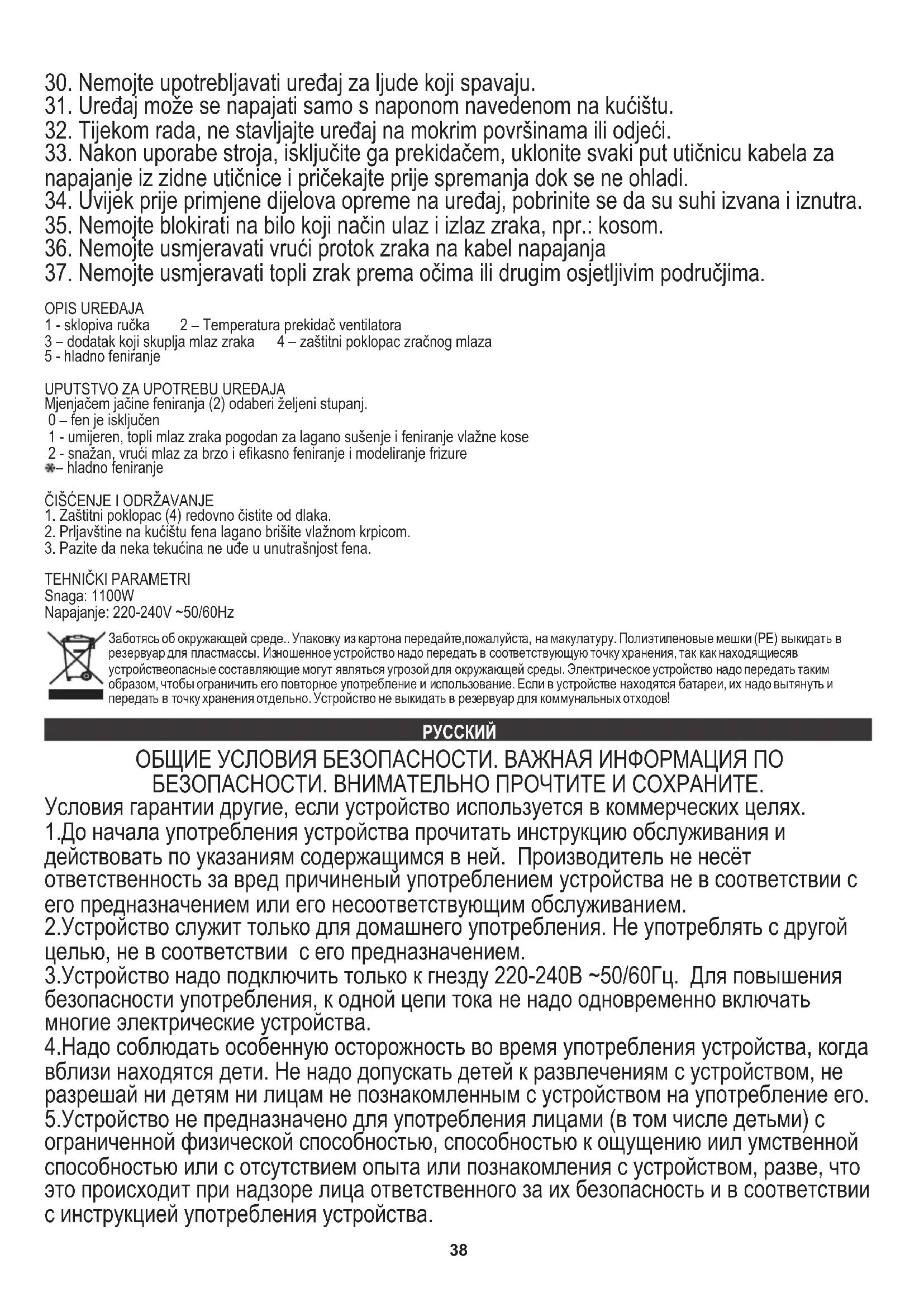 ОБЩИЕ УСЛОВИЯ БЕЗОПАСНОСТИ. ВАЖНАЯ ИНФОРМАЦИЯ ПО БЕЗОПАСНОСТИ. ВНИМАТЕЛЬНО ПРОЧТИТЕ И СОХРАНИТЕ. Условия гарантии другие, если устройство используется в коммерческих целях. 5.Устройство не предназначено для употребления лицами (в том числе детьми) с ограниченной физической способностью, способностью к ощущению иил умственной способностью или с отсутствием опыта или познакомления с устройством, разве, что это происходит при надзоре лица ответственного за их безопасность и в соответствии с инструкцией употребления устройства. 1.До начала употребления устройства прочитать инструкцию обслуживания и действовать по указаниям содержащимся в ней. Производитель не несёт ответственность за вред причиненый употреблением устройства не в соответствии с его предназначением или его несоответствующим обслуживанием. 3.Устройство надо подключить только к гнезду 220-240В ~50/60Гц. Для повышения безопасности употребления, к одной цепи тока не надо одновременно включать многие электрические устройства. 4.Надо соблюдать особенную осторожность во время употребления устройства, когда вблизи находятся дети. Не надо допускать детей к развлечениям с устройством, не разрешай ни детям ни лицам не познакомленным с устройством на употребление его. 2.Устройство служит только для домашнего употребления. Не употреблять с другой целью, не в соответствии с его предназначением.39