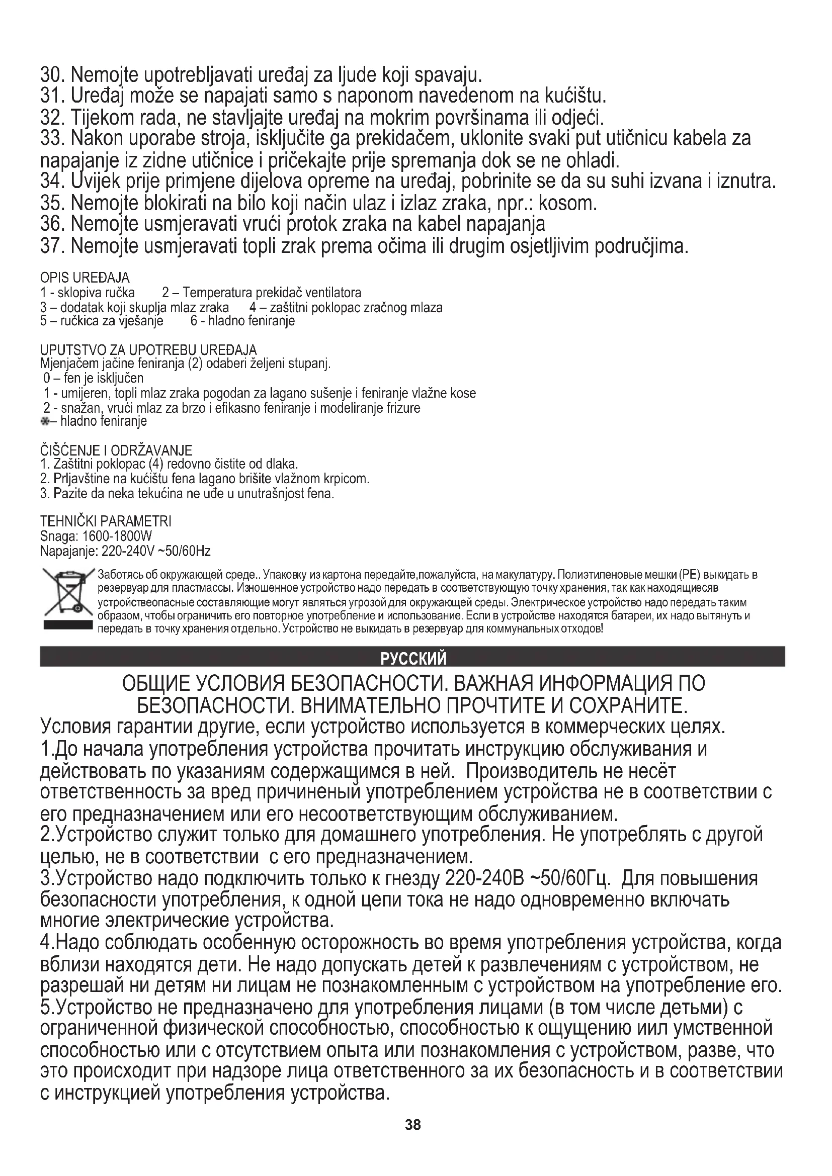 1.До начала употребления устройства прочитать инструкцию обслуживания и действовать по указаниям содержащимся в ней. Производитель не несёт ответственность за вред причиненый употреблением устройства не в соответствии с его предназначением или его несоответствующим обслуживанием. 2.Устройство служит только для домашнего употребления. Не употреблять с другой целью, не в соответствии с его предназначением. Условия гарантии другие, если устройство используется в коммерческих целях. 4.Надо соблюдать особенную осторожность во время употребления устройства, когда вблизи находятся дети. Не надо допускать детей к развлечениям с устройством, не разрешай ни детям ни лицам не познакомленным с устройством на употребление его. 5.Устройство не предназначено для употребления лицами (в том числе детьми) с ограниченной физической способностью, способностью к ощущению иил умственной способностью или с отсутствием опыта или познакомления с устройством, разве, что это происходит при надзоре лица ответственного за их безопасность и в соответствии с инструкцией употребления устройства. ОБЩИЕ УСЛОВИЯ БЕЗОПАСНОСТИ. ВАЖНАЯ ИНФОРМАЦИЯ ПО БЕЗОПАСНОСТИ. ВНИМАТЕЛЬНО ПРОЧТИТЕ И СОХРАНИТЕ. 3.Устройство надо подключить только к гнезду 220-240В ~50/60Гц. Для повышения безопасности употребления, к одной цепи тока не надо одновременно включать многие электрические устройства.39