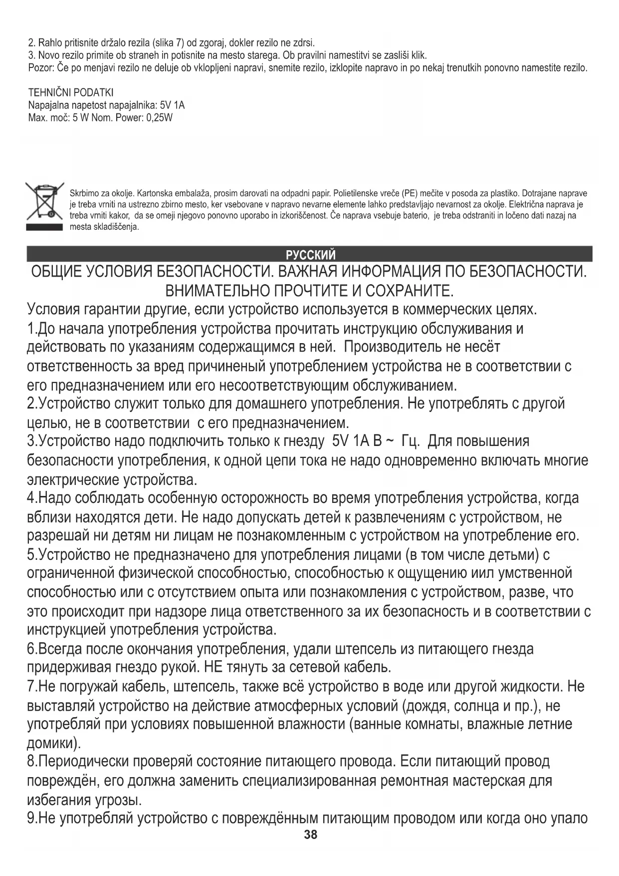 Внимание: Если лезвие после замены не работает при включении, снимите лезвие, включите на момент устройство и снова вставьте лезвие. Питание адаптера: Максимальная мощность: 5 Nom. Power:0,25 ТЕХНИЧЕСКИЕ ПАРАМЕТРЫ 5V 1A