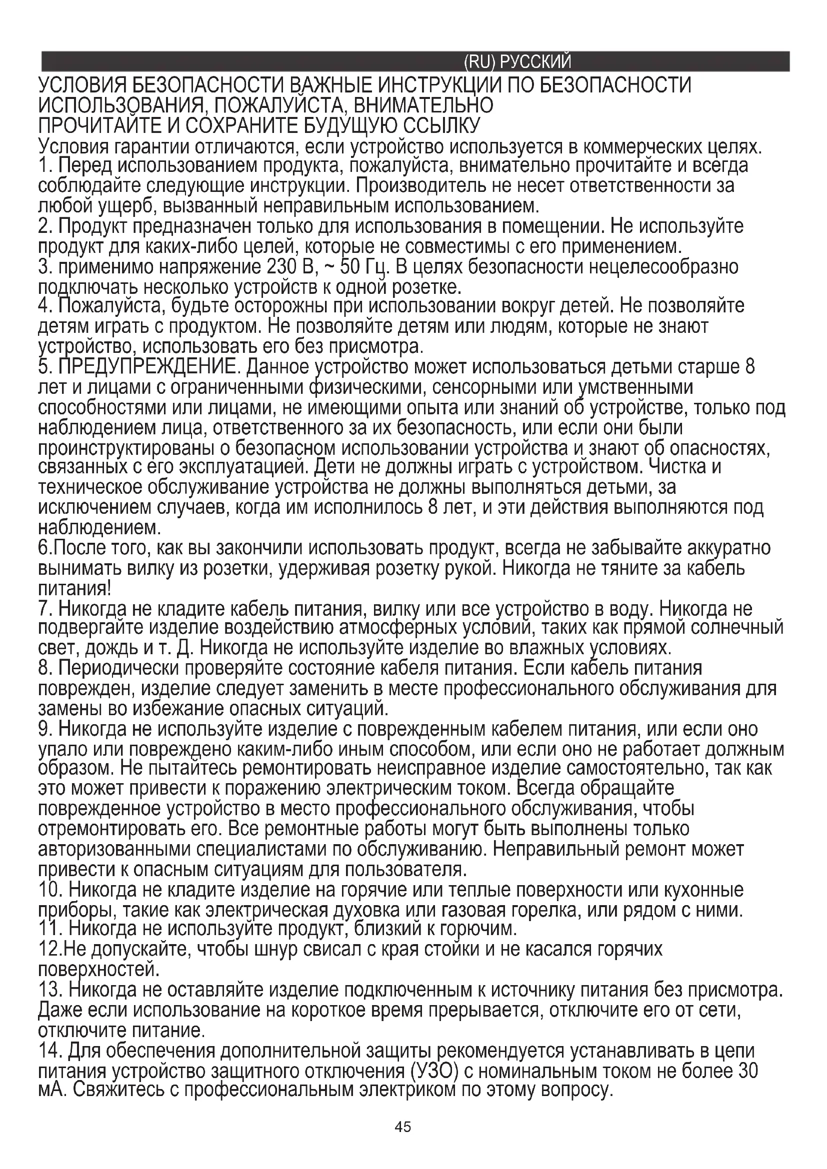лет и лицами с ограниченными физическими, сенсорными или умственными способностями или лицами, не имеющими опыта или знаний об устройстве, только под наблюдением лица, ответственного за их безопасность, или если они были проинструктированы о безопасном использовании устройства и знают об опасностях, связанных с его эксплуатацией. Дети не должны играть с устройством. Чистка и техническое обслуживание устройства не должны выполняться детьми, за исключением случаев, когда им исполнилось 8 лет, и эти действия выполняются под наблюдением. 6.После того, как вы закончили использовать продукт, всегда не забывайте аккуратно вынимать вилку из розетки, удерживая розетку рукой. Никогда не тяните за кабель