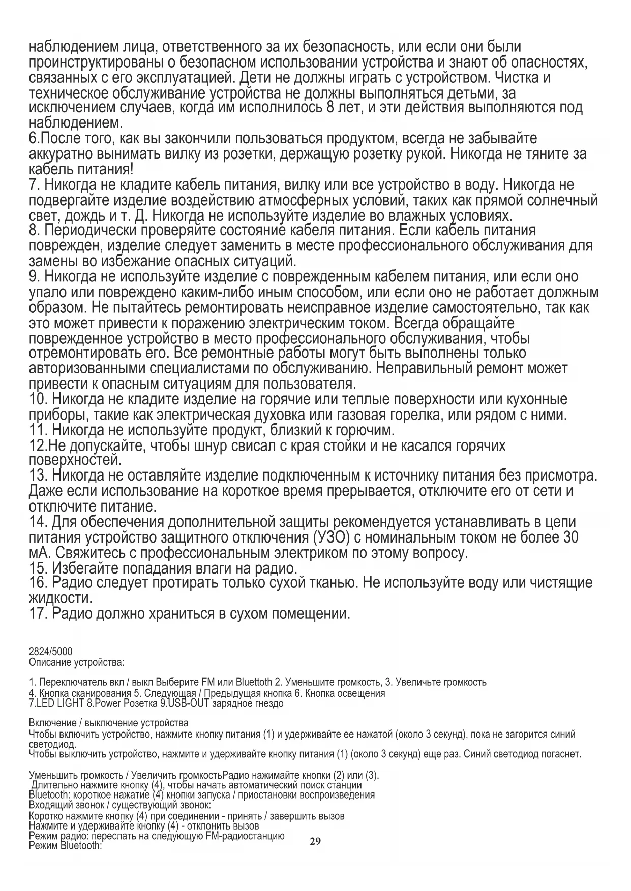 лет и лицами с ограниченными физическими, сенсорными или умственными способностями или лицами, не имеющими опыта или знаний об устройстве, только под 28наблюдением лица, ответственного за их безопасность, или если они были проинструктированы о безопасном использовании устройства и знают об опасностях, связанных с его эксплуатацией. Дети не должны играть с устройством. Чистка и техническое обслуживание устройства не должны выполняться детьми, за исключением случаев, когда им исполнилось 8 лет, и эти действия выполняются под наблюдением. 6.После того, как вы закончили пользоваться продуктом, всегда не забывайте аккуратно вынимать вилку из розетки, держащую розетку рукой. Никогда не тяните за кабель питания!