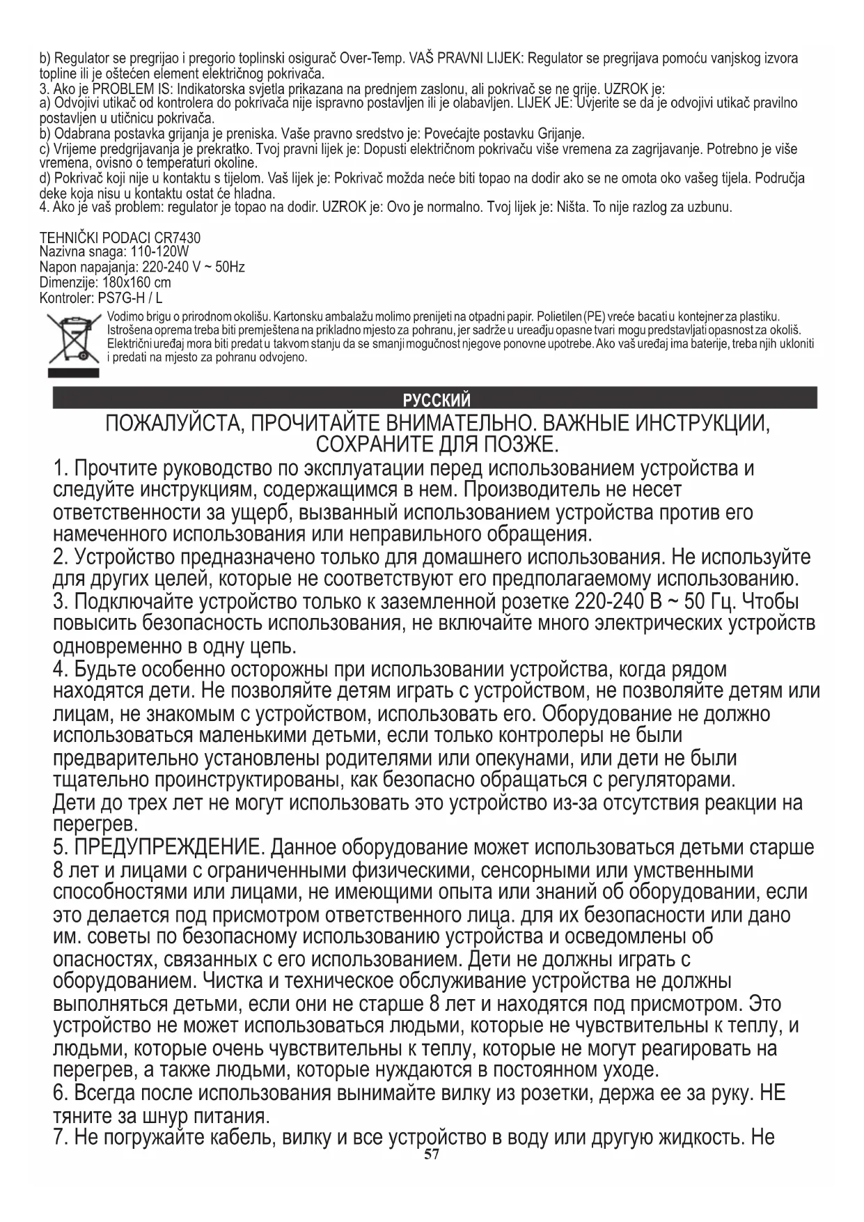 «P» появляется. ПРИЧИНА: Возможно, что контроллер или соединитель не подключены. Ваше СРЕДСТВО: Пожалуйста, выключите контроллер и заново подключите соединитель. Если вы не можете устранить неполадки, это означает, что внутреннее соединение электрического одеяла нарушено. Нужно отремонтировать или сдать на слом. ТЕХНИЧЕСКИЕ ДАННЫЕ CR7430 в) Время предварительного нагрева слишком короткое. Ваше СРЕДСТВО: Дайте электрическому одеялу больше времени для нагрева. В зависимости от температуры окружающей среды требуется больше времени. Напряжение питания: 220-240 В ~ 50 Гц