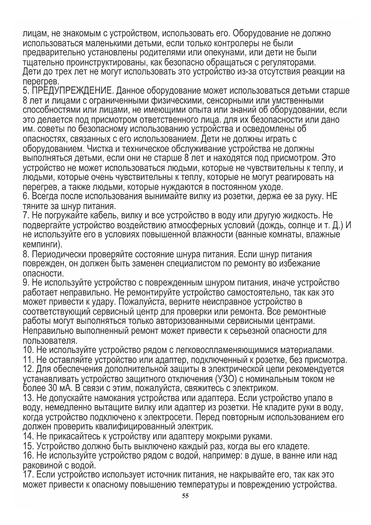 8 лет и лицами с ограниченными физическими, сенсорными или умственными способностями или лицами, не имеющими опыта или знаний об оборудовании, если это делается под присмотром ответственного лица. для их безопасности или дано им. советы по безопасному использованию устройства и осведомлены об опасностях, связанных с его использованием. Дети не должны играть с оборудованием. Чистка и техническое обслуживание устройства не должны выполняться детьми, если они не старше 8 лет и находятся под присмотром. Это устройство не может использоваться людьми, которые не чувствительны к теплу, и людьми, которые очень чувствительны к теплу, которые не могут реагировать на перегрев, а также людьми, которые нуждаются в постоянном уходе.