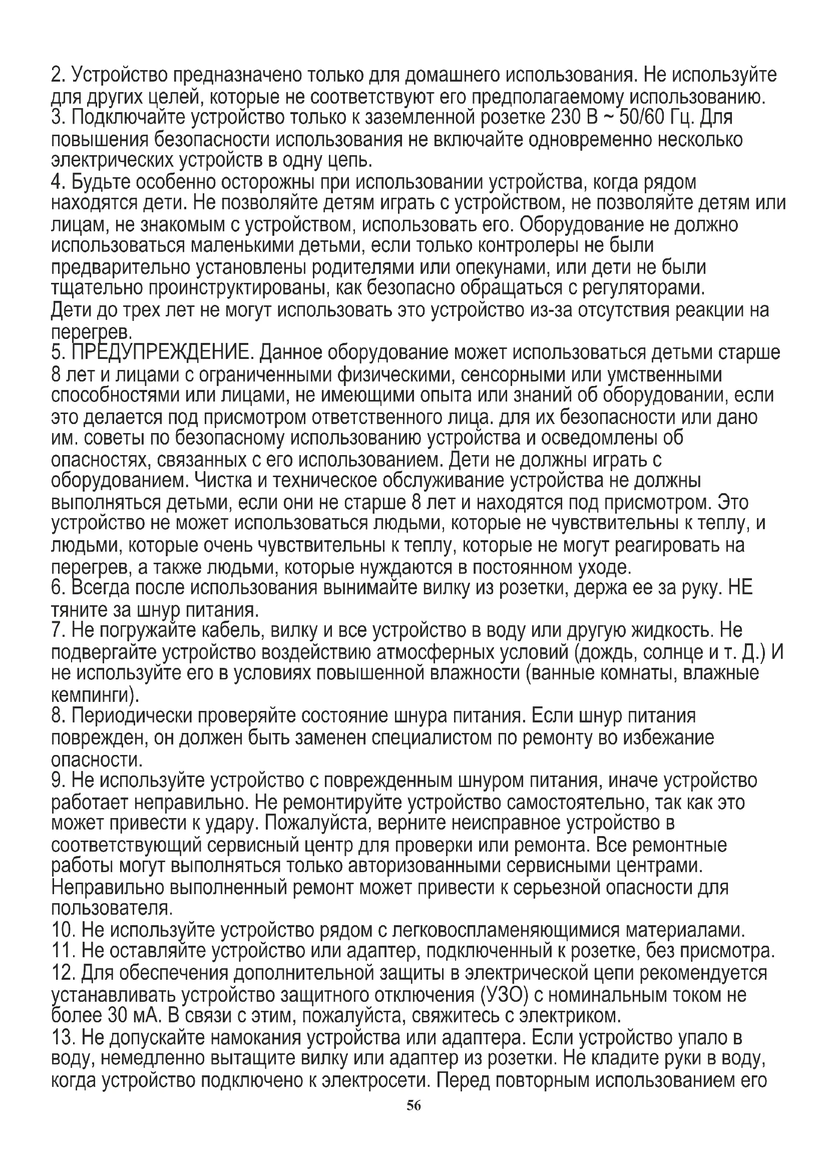 8 лет и лицами с ограниченными физическими, сенсорными или умственными способностями или лицами, не имеющими опыта или знаний об оборудовании, если это делается под присмотром ответственного лица. для их безопасности или дано им. советы по безопасному использованию устройства и осведомлены об опасностях, связанных с его использованием. Дети не должны играть с оборудованием. Чистка и техническое обслуживание устройства не должны выполняться детьми, если они не старше 8 лет и находятся под присмотром. Это устройство не может использоваться людьми, которые не чувствительны к теплу, и людьми, которые очень чувствительны к теплу, которые не могут реагировать на перегрев, а также людьми, которые нуждаются в постоянном уходе.
