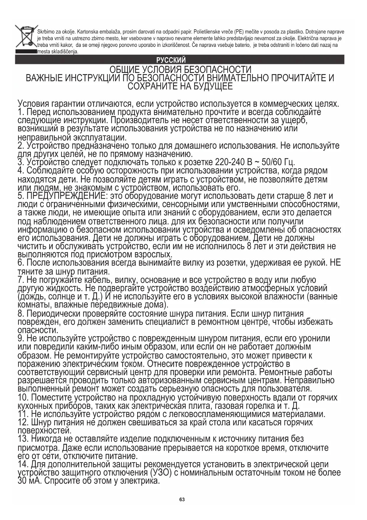 ОБЩИЕ УСЛОВИЯ БЕЗОПАСНОСТИ ВАЖНЫЕ ИНСТРУКЦИИ ПО БЕЗОПАСНОСТИ ВНИМАТЕЛЬНО ПРОЧИТАЙТЕ И СОХРАНИТЕ НА БУДУЩЕЕ Условия гарантии отличаются, если устройство используется в коммерческих целях.
